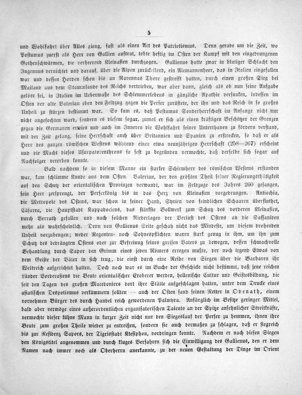und Wohlfahrt über Alles gieng, faſt als einen Act des Patriotismus. Denn gerade um die Zeit, wo Poſtumus zuerſt als Herr von Gallien auftrat, tobte heftig im Oſten der Kampf mit den eingedrungenen Gothenſchwärmen, die verheerend Kleinaſien durchzogen. Gallienus hatte zwar in blutiger Schlacht den Ingenuus vernichtet und darauf, über die Alpen zurückeilend, ein Alemannenheer, das in Italien eingefallen war und deſſen Horden ſchon bis an Ravennas Thore geſtreift hatten, durch einen großen Sieg bei Mailand aus dem Stammlande des Reichs vertrieben, war aber dann, gleich als ob nun ſeine Aufgabe gelöst ſei, in Italien im Uebermaße des Schlemmerlebens in gänzliche Apathie verſunken, indeſſen im Oſten der alte Valerian eben den Feldzug gegen die Perſer zurüſtete, der ihn und das Reich in ſo großes Unheil zu ſtürzen beſtimmt war. So kam es, daß Poſtumus Sonderherrſchaft im Anfange nicht nur nicht angefochten ward, ſondern es dieſem ſogar, zumal er ſich als einen kräftigen Beſchützer der Grenzen gegen die Germanen erwies und auch im Inneren die Wohlfahrt ſeiner Unterthanen zu fördern verſtand, mit der Zeit gelang, ſeine Herrſchaft auch über Britannien und Spanien zu erſtrecken, ſo daß er als Herr des ganzen römiſchen Weſtens während einer etwa neunjährigen Herrſchaft(258— 267) erſcheint und die Macht dieſes Uſurpatorenthrons ſo feſt zu begründen vermochte, daß derſelbe ſich ſogar auf Nachfolger vererben konnte.