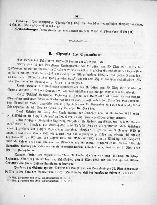 Durch Beſchluß des Königlichen Adminiſtrators von Kurheſſen vom 30. Merz 1867 wurde der Gymnaſialpraktikant Albert Duncker**) mit Aushülfeleiſtung am hieſigen Gymnaſium beauftragt.