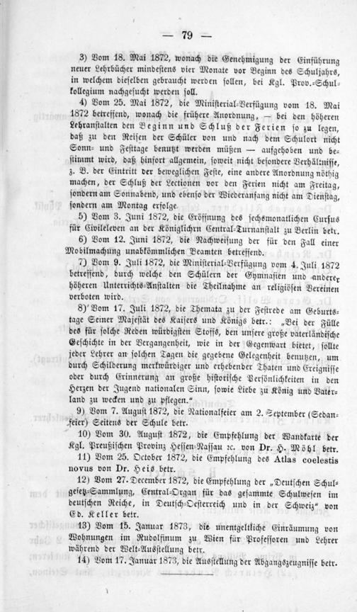 3) Vom 18. Mai 1872, wonach die Genehmigung der Einführung neuer Lehrbücher mindeſtens vier Monate vor Beginn des Schuljahrs, in welchem dieſelben gebraucht werden ſollen, bei Kgl. Prov.⸗Schul⸗ kollegium nachgeſucht werden ſoll.