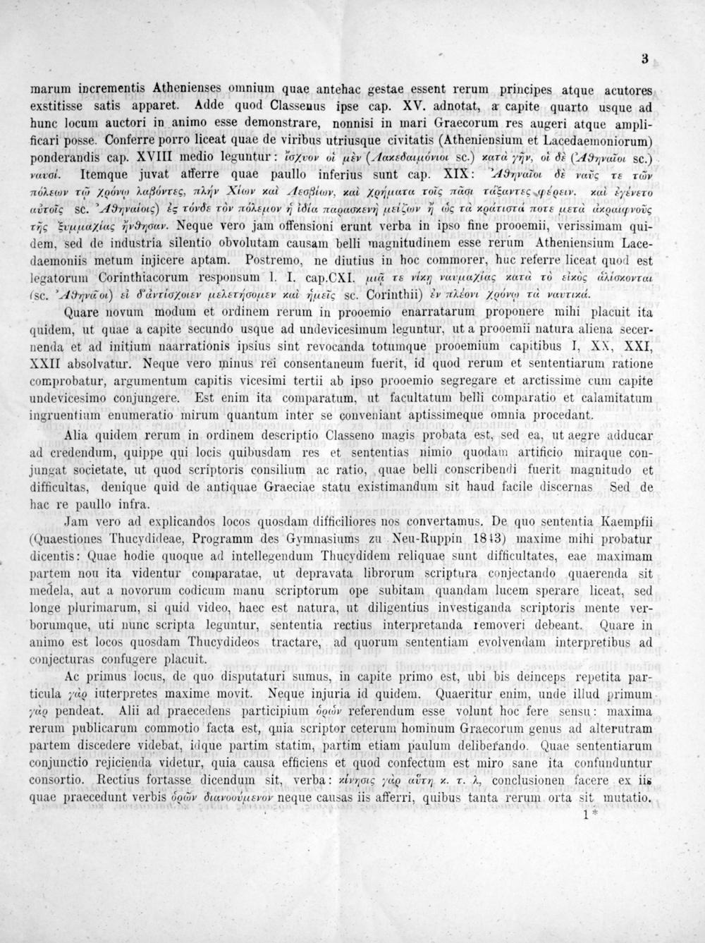 Jam vero ad explicandos locos quosdam difficiliores nos convertamus. De quo sententia Kaempfii (Quaestiones Thucydideae, Programm des Gymnasiums zu Neu-Ruppin 18 13) maxime mihi probatur dicentis: Quae hodie quoque ad intellegendum Thucydidem reliquae sunt difficultates, eae maximam partem nou ita videntur comparatae, ut depravata librorum scriptura conjectando quaerenda sit medela, aut a novorum codicum manu scriptorum ope subitam quandam lucem sperare liceat, sed longe plurimarum, si quid video, haec est natura, ut diligentius investiganda scriptoris mente ver- borumque, uti nunc scripta leguntur, sententia rectius interpretanda removeri debeant. Quare in animo est locos quosdam Thucydideos tractare, ad quorum sententiam evolvendam interpretibus ad conjecturas confugere placuit.