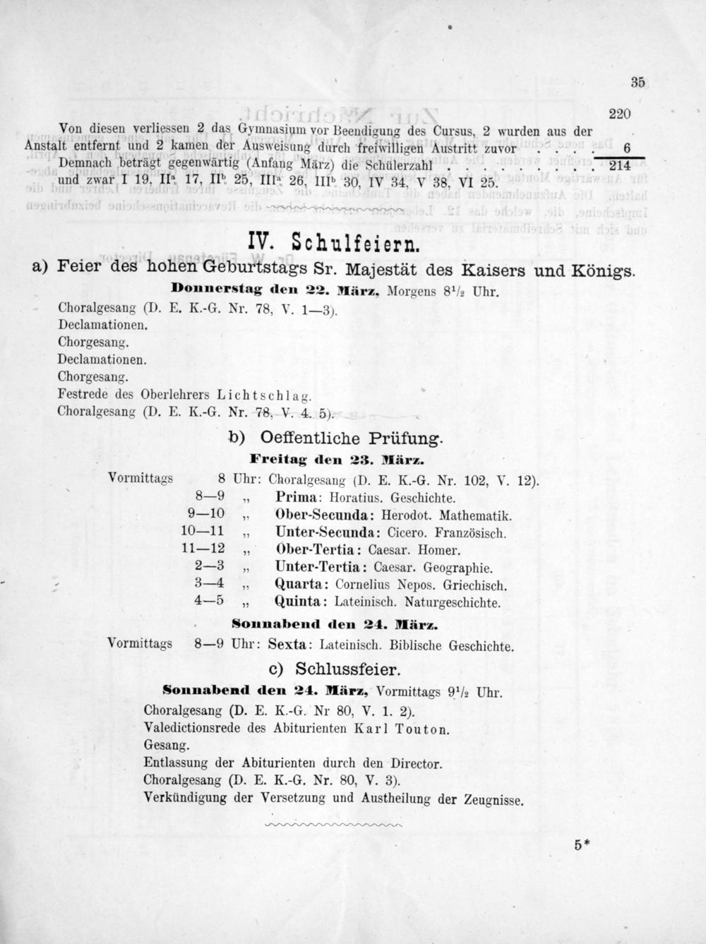 c) Schlussfeier. Sonnabend den 24. März, Vormittags 9 ½ Uhr. Choralgesang(D. E. K.-G. Nr 80, V. 1. 2). Valedictionsrede des Abiturienten Karl Touton. Gesang. Entlassung der Abiturienten durch den Director. Choralgesang(D. E. K.-G. Nr. 80, V. 3). Verkündigung der Versetzung und Austheilung der Zeugnisse.