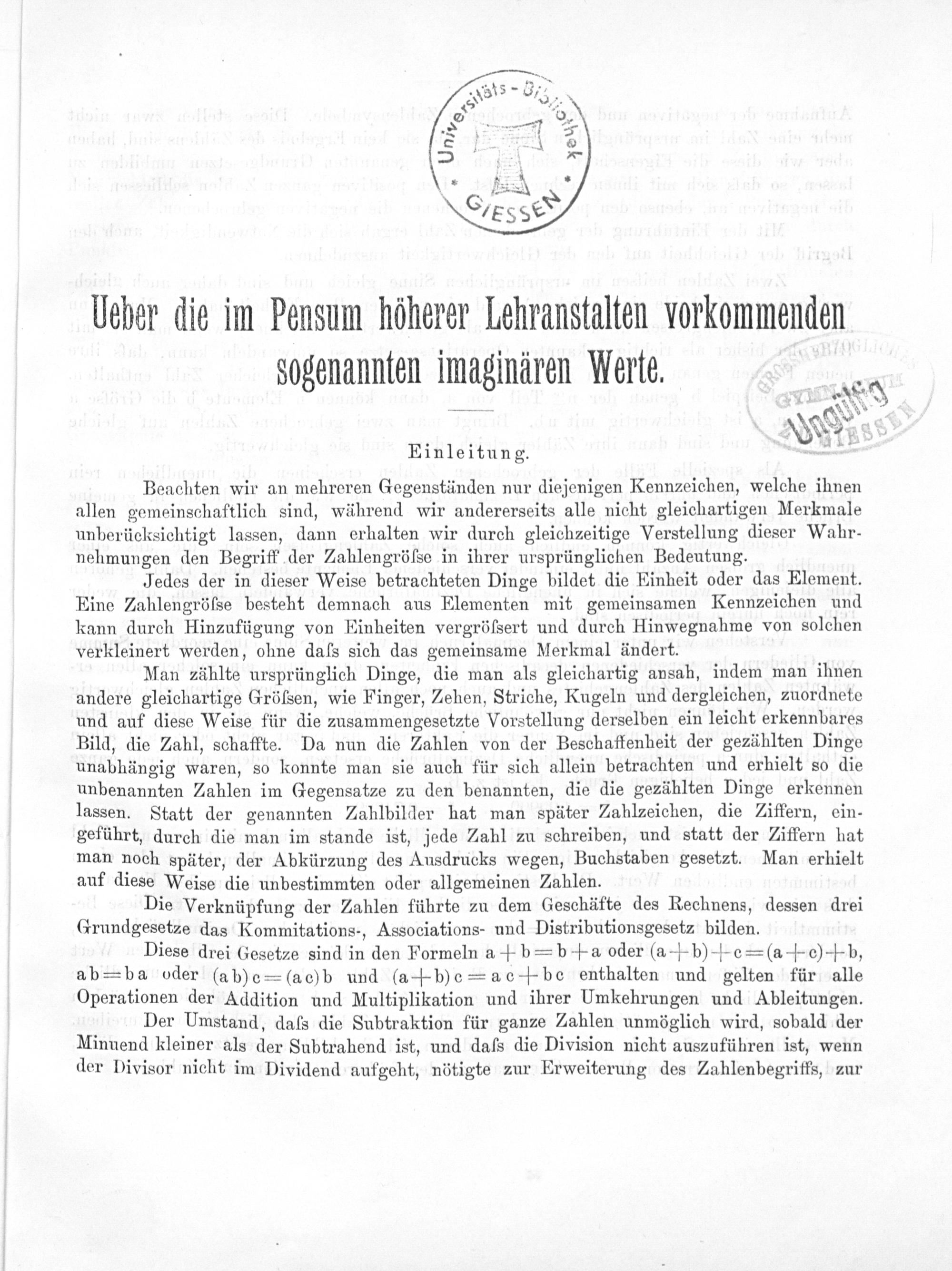 Ueber die im Pensum höherer Lehranstalten vorkommenden sogenannten imaginären Werte.