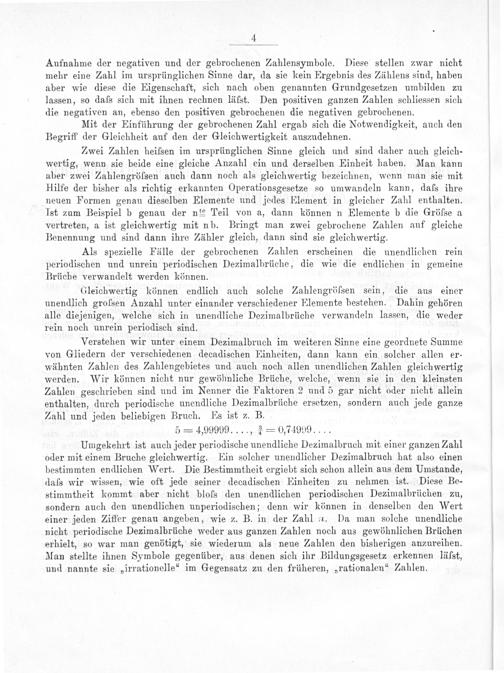 Gleichwertig können endlich auch solche Zahlengröſsen sein, die aus einer unendlich groſsen Anzahl unter einander verschiedener Elemente bestehen. Dahin gehören alle diejenigen, welche sich in unendliche Dezimalbrüche verwandeln lassen, die weder rein noch unrein periodisch sind.