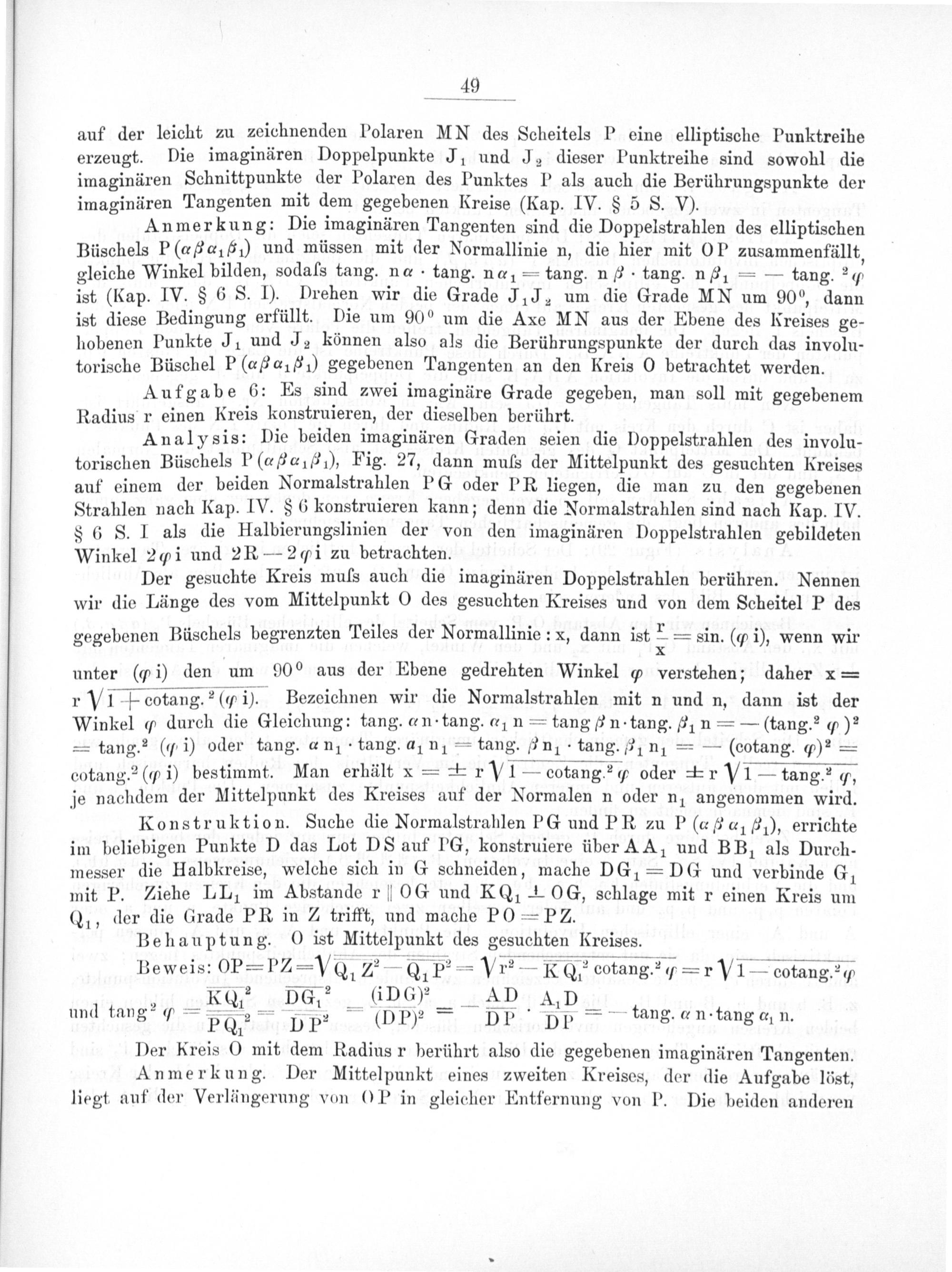 49 auf der leicht zu zeichnenden Polaren MN des Scheitels P eine elliptische Punktreihe erzeugt. Die imaginären Doppelpunkte Ji und Je dieser Punktreihe sind sowohl die imaginären Schnittpunkte der Polaren des Punktes P als auch die Berührungspunkte der imaginären Tangenten mit dem gegebenen Kreise(Kap. IV.§ 5 S. V).