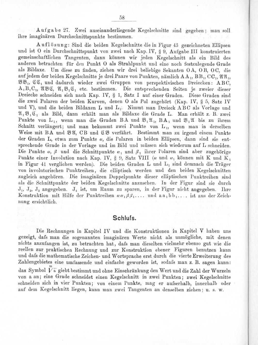 Im das Symbol a giebt bestimmt und ohne Einschränkung den Wert und die Zahl der Wurzeln von a an; eine Grade schneidet einen Kegelschnitt in zwei Punkten; zwei Kegelschnitte schneiden sich in vier Punkten; von einem Punkte, mag er aufserhalb, innerhalb oder auf dem Kegelschnitt liegen, kann man zwei Tangenten an denselben ziehen; u. s. w.