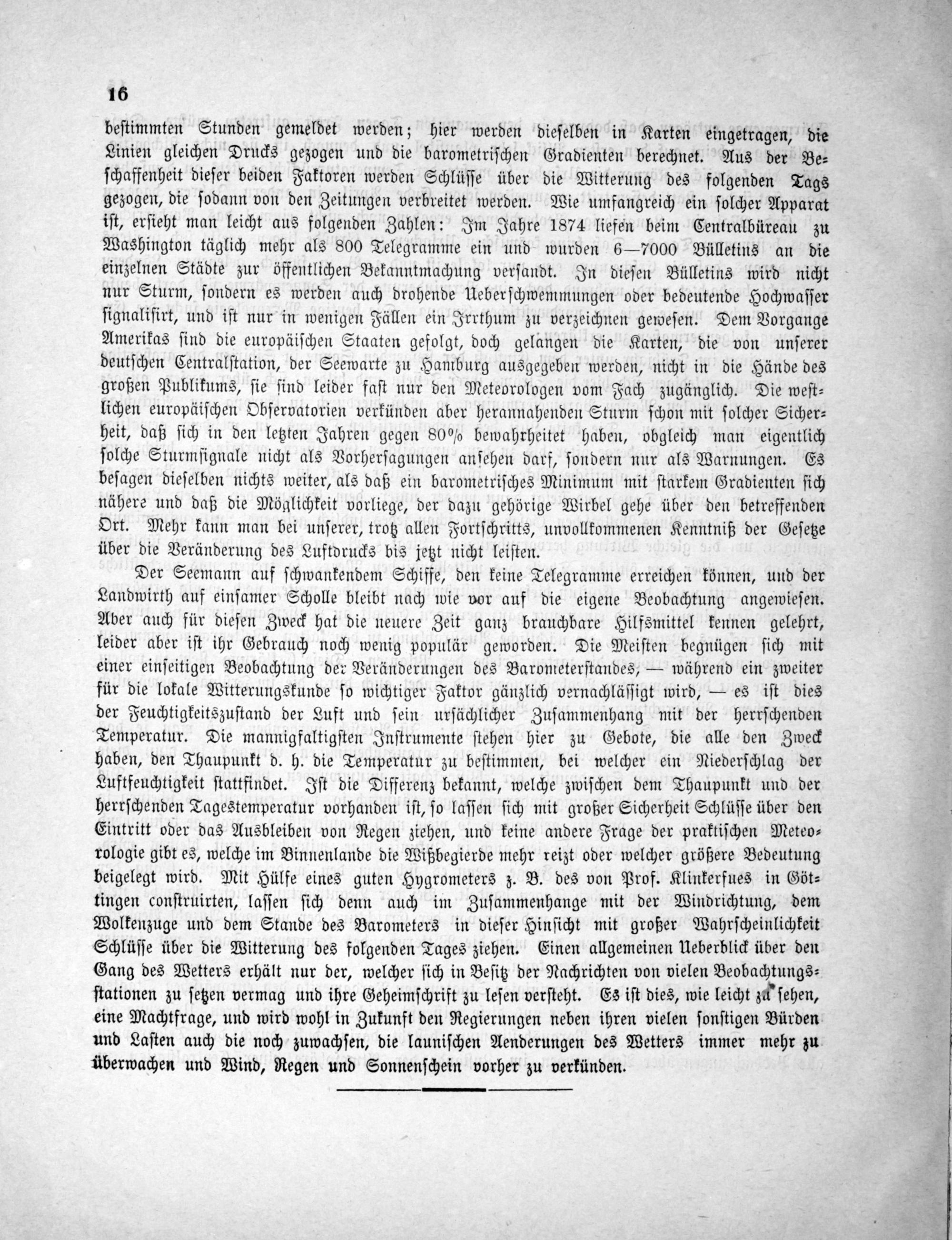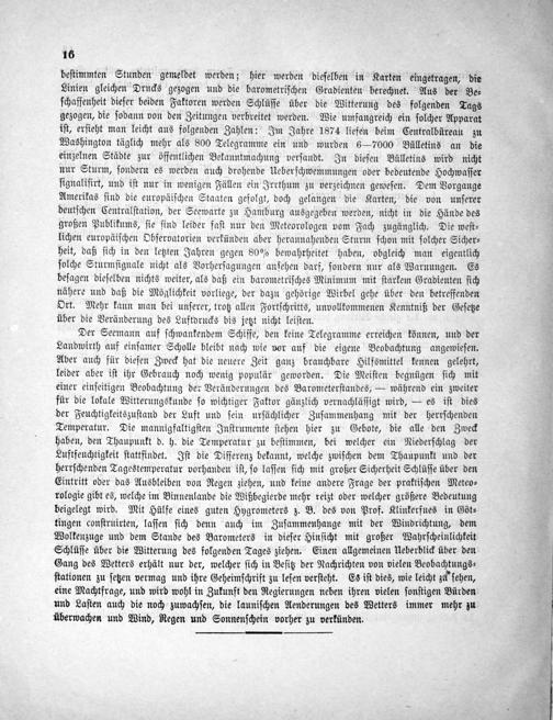 beſtimmten Stunden gemeldet werden; hier werden dieſelben in Karten eingetragen, die Linien gleichen Drucks gezogen und die barometriſchen Gradienten berechnet. Aus der Be⸗ ſchaffenheit dieſer beiden Faktoren werden Schlüſſe über die Witterung des folgenden Tags gezogen, die ſodann von den Zeitungen verbreitet werden. Wie umfangreich ein ſolcher Apparat iſt, erſieht man leicht aus folgenden Zahlen: Im Jahre 1874 liefen beim Centralbüreau zu Washington täglich mehr als 800 Telegramme ein und wurden 6—7000 Bülletins an die einzelnen Städte zur öffentlichen Bekanntmachung verſandt. In dieſen Bülletins wird nicht nur Sturm, ſondern es werden auch drohende Ueberſchwemmungen oder bedeutende Hochwaſſer ſignaliſirt, und iſt nur in wenigen Fällen ein Irrthum zu verzeichnen geweſen. Dem Vorgange Amerikas ſind die europäiſchen Staaten gefolgt, doch gelangen die Karten, die von unſerer deutſchen Centralſtation, der Seewarte zu Hamburg ausgegeben werden, nicht in die Hände des großen Publikums, ſie ſind leider faſt nur den Meteorologen vom Fach zugänglich. Die weſt⸗ lichen europäiſchen Obſervatorien verkünden aber herannahenden Sturm ſchon mit ſolcher Sicher⸗ heit, daß ſich in den letzten Jahren gegen 80% bewahrheitet haben, obgleich man eigentlich ſolche Sturmſignale nicht als Vorherſagungen anſehen darf, ſondern nur als Warnungen. Es beſagen dieſelben nichts weiter, als daß ein barometriſches Minimum mit ſtarkem Gradienten ſich nähere und daß die Möglichkeit vorliege, der dazu gehörige Wirbel gehe über den betreffenden Ort. Mehr kann man bei unſerer, trotz allen Fortſchritts, unvollkommenen Kenntniß der Geſetze über die Veränderung des Luftdrucks bis jetzt nicht leiſten.