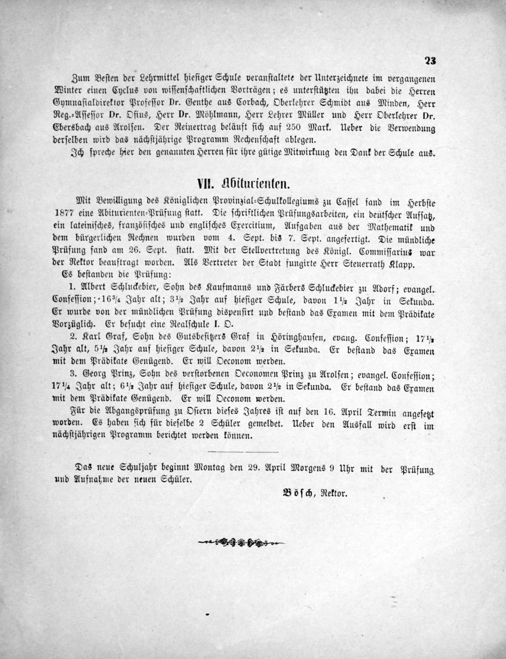 Mit Bewilligung des Königlichen Provinzial⸗Schulkollegiums zu Caſſel fand im Herbſte 1877 eine Abiturienten⸗Prüfung ſtatt. Die ſchriftlichen Prüfungsarbeiten, ein deutſcher Aufſatz, ein lateiniſches, franzöſiſches und engliſches Exercitium, Aufgaben aus der Mathematik und dem bürgerlichen Rechnen wurden vom 4. Sept. bis 7. Sept. angefertigt. Die mündliche Prüfung fand am 26. Sept. ſtatt. Mit der Stellvertretung des Königl. Commiſſarius war der Nektor beauftragt worden. Als Vertreter der Stadt fungirte Herr Steuerrath Klapp.