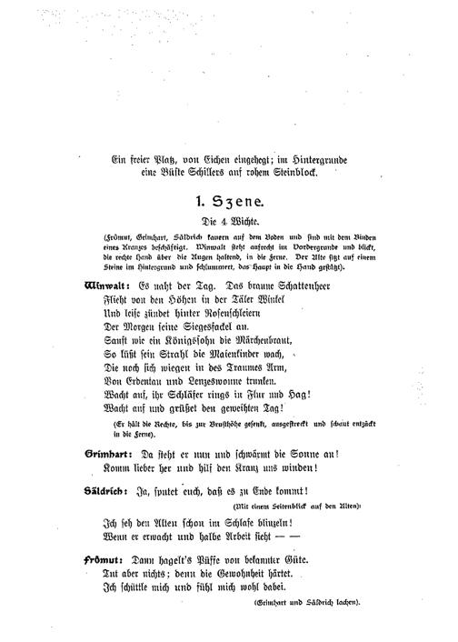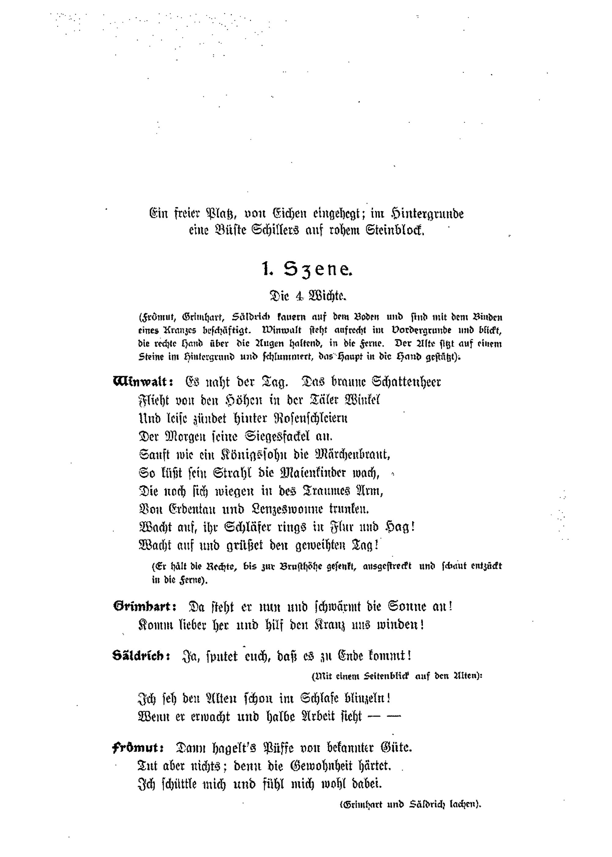 WUinwalt: Es naht der Tag. Das braune schattenheer Flieht von den Höhen in der Täler Winkel Und leise zündet hinter Rosenschleiern Der Morgen seine siegesfackel an. saust wie ein Königssohn die Märchenbraut, so küßt sein strahl die Maienkinder wach, Die noch sich wiegen in des Traumes Arm, Von Erdentan und Lenzeswonne trunken. Wacht auf, ihr schläfer rings in Flur und Hag! Wacht auf und grüßet den geweihten Tag! (Er hält die Rechte, bis zur Brusthöhe gesenkt, ausgestreckt und schaut entzũckt in die Ferne). Grimhart: Da steht er nun und schwärmt die sonne an! Komm lieber her und hilf den Kranz uns winden!