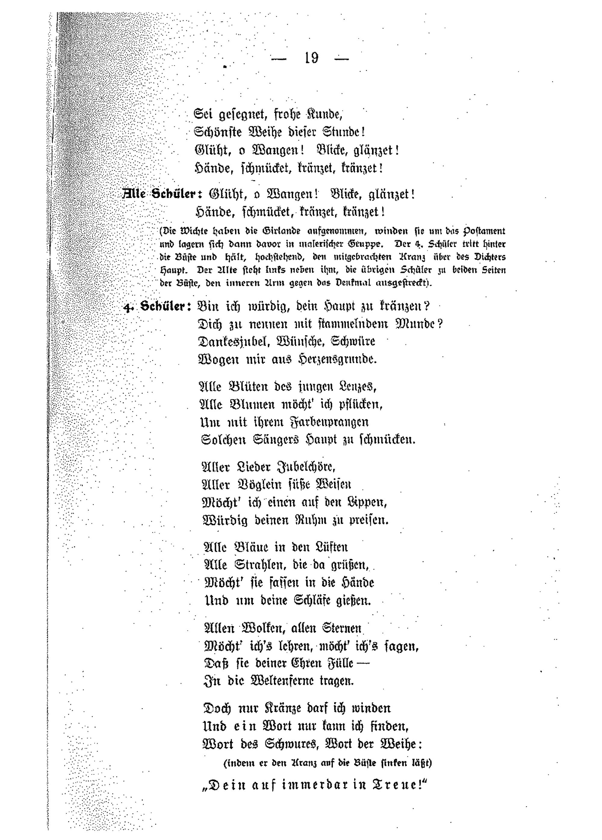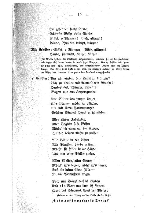 (Die Wichte haben die Girlande aufgenommen, winden sie um das Postament und lagern sich dann davor in malerischer Gruppe. Der 4. schüler tritt hinter die Büͤste und hält, hochstehend, den mitgebrachten Nranz über des Dichters Baupt. Der Alte steht links neben ihnt, die übrigen schüler zu beiden seiten der Bäste, den inneren Arm gegen das denkmal ausgestreckt).