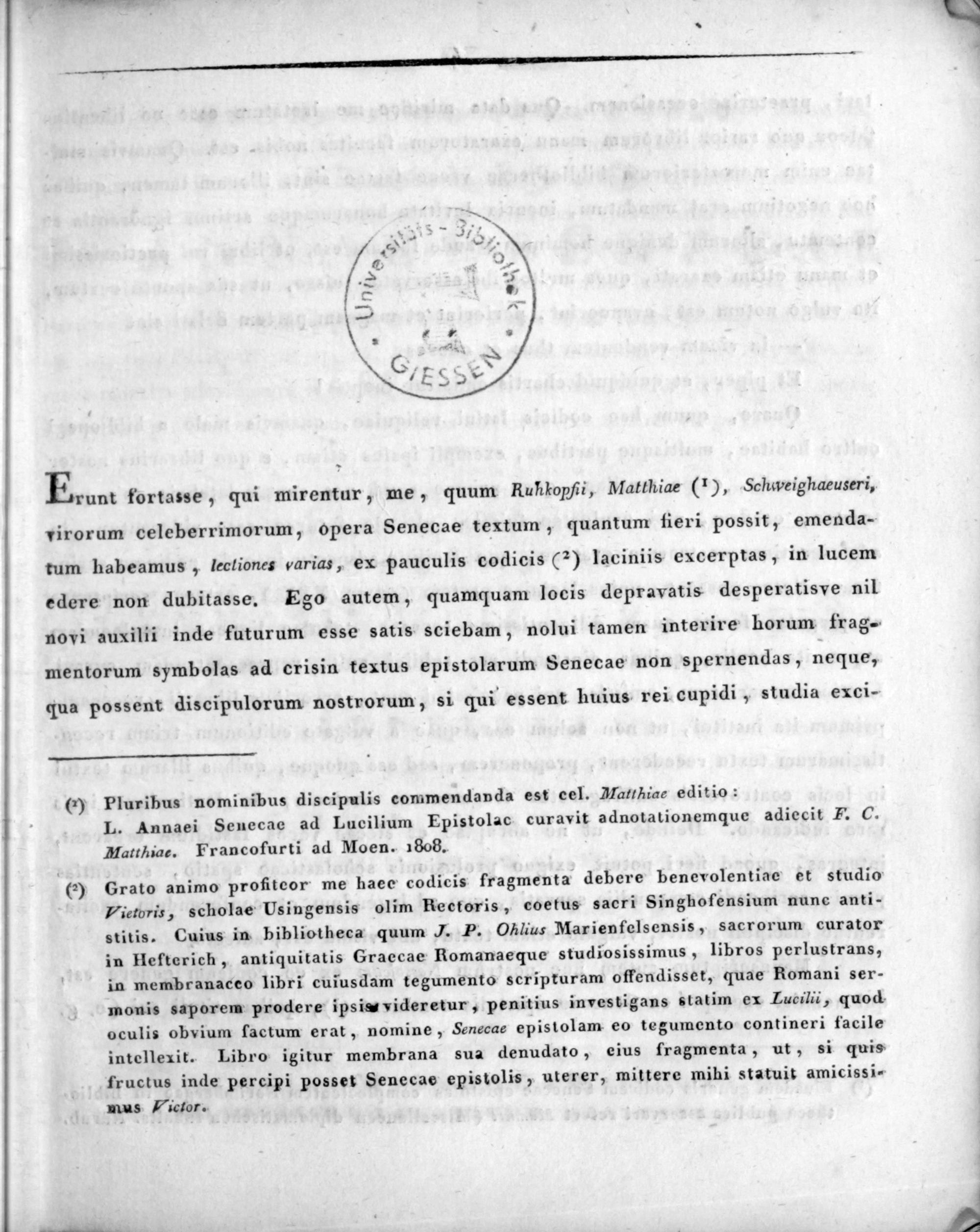 Eram fortasse, qui mirentur, me, duum Ruhkopfii, Matthiae(1), Scheveighaeuseri, virorum celeberrimorum, opera Senecae textum, quantum fieri possit, emenda- tum habeamus, lectiones varias, ex pauculis codicis(*) laciniis excerptas, in lucem edere non dubitasse. Ego autem, quamquam locis depravatis desperatisve nil novi auxilii inde futurum esse satis sciebam, nolui tamen interire horum frag- mentorum symbolas ad crisin textus epistolarum Senecae non spernendas, neque,