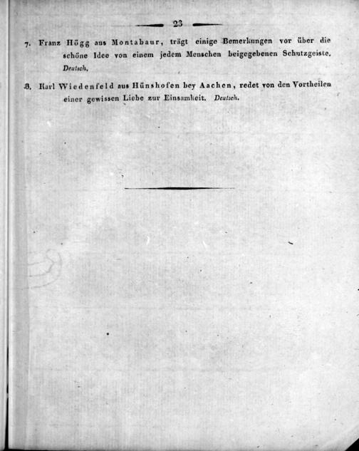 7. Franz Högg aus Montabaur, trägt einige Bemerkungen vor über die schöne Idee von einem jedem Menschen beigegebenen Schutzgeiste.