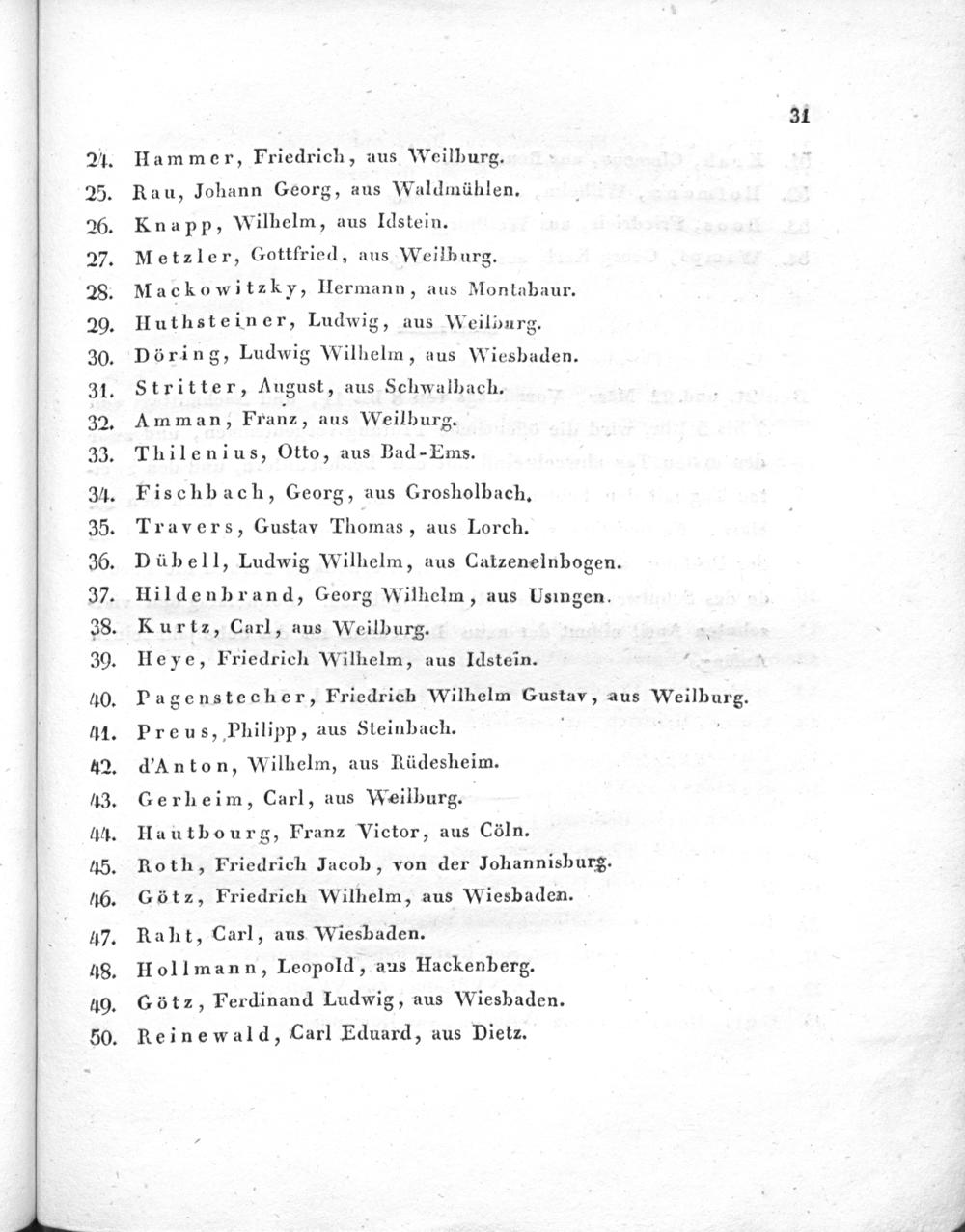 Metzler, Gottfried, aus Weilburg. Mackowitzky, Hermann, aus Montabaur. II uths teiner, Ludwig, aus Weilburg. Döring, Ludwig Wilhelm, aus Wiesbaden. Stritter, August, aus Schwalbach. Amman, Franz, aus Weilburg.