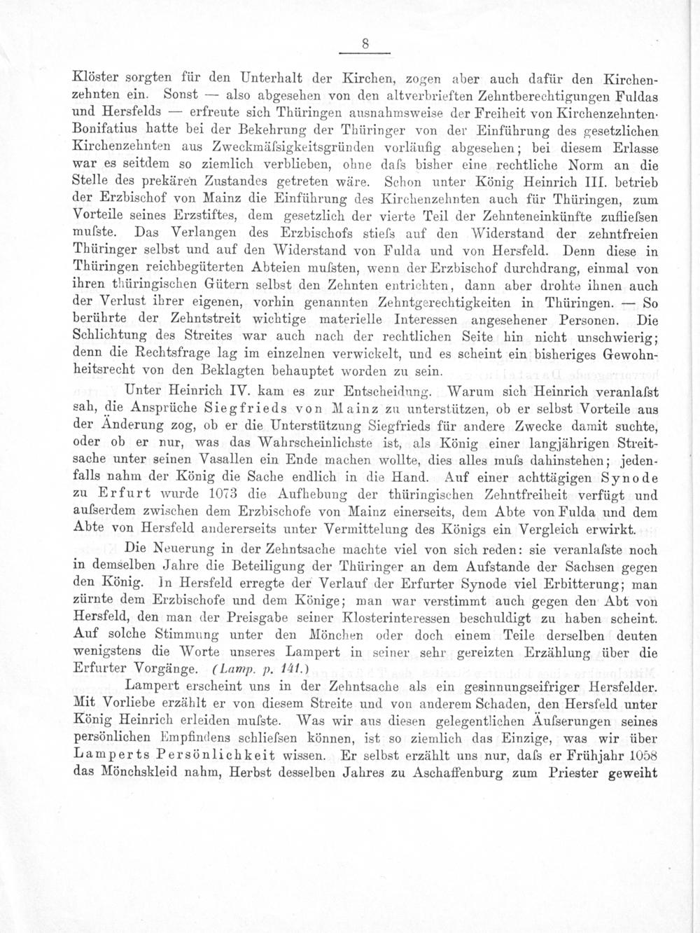 Lampert erscheint uns in der Zehntsache als ein gesinnungseifriger Hersfelder. Mit Vorliebe erzählt er von diesem Streite und von anderem Schaden, den Hersfeld unter König Heinrich erleiden muſste. Was wir aus diesen gelegentlichen Kuſserungen seines persönlichen Empfindens schlieſsen können, ist so ziemlich das Einzige, was wir über Lamperts Persönlichkeit wissen. Er selbst erzählt uns nur, daſs er Frühjahr 1058 das Mönchskleid nahm, Herbst desselben Jahres zu Aschaffenburg zum Priester geweiht