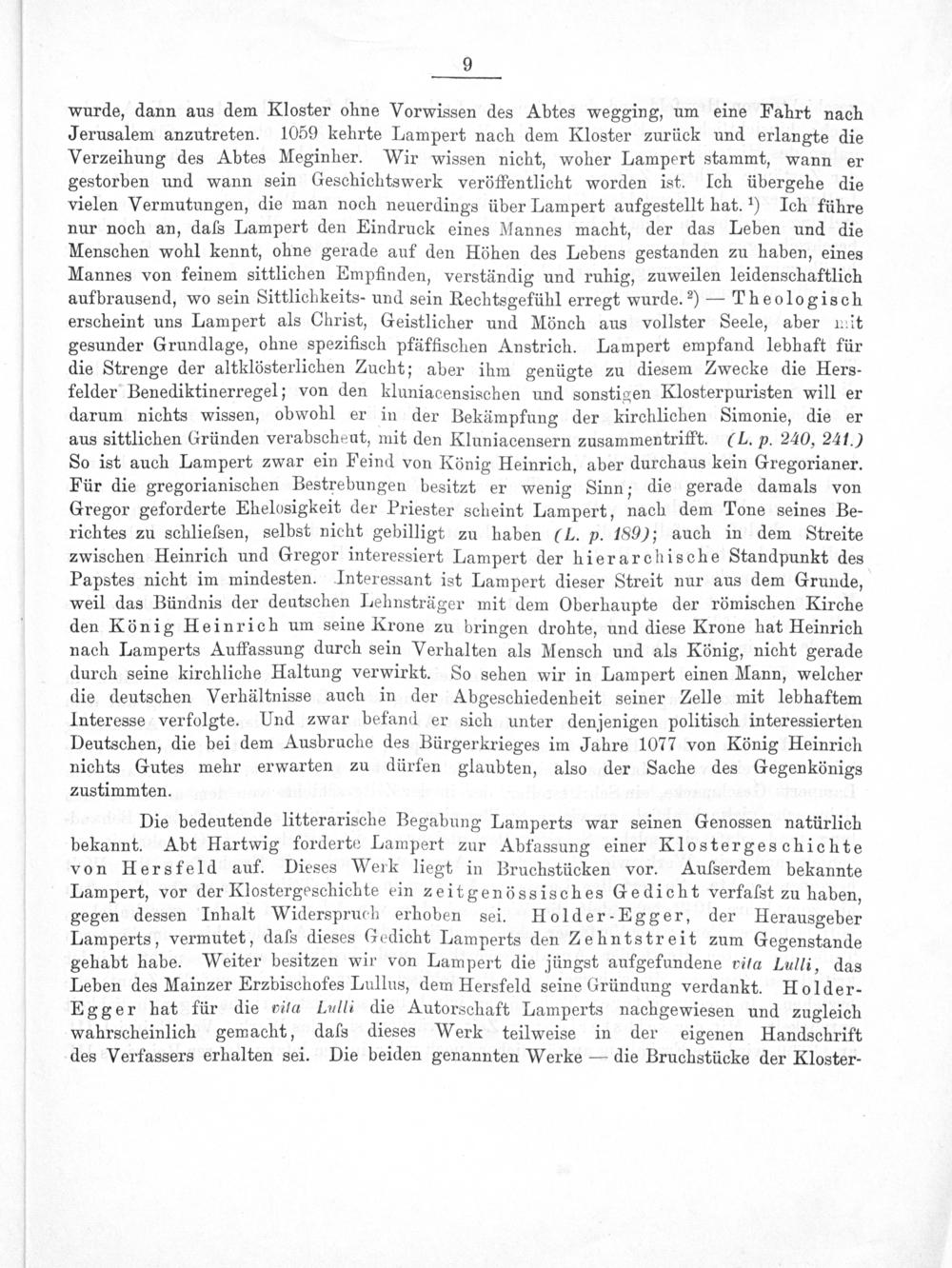 wurde, dann aus dem Kloster ohne Vorwissen des Abtes wegging, um eine Fahrt nach Jerusalem anzutreten. 1059 kehrte Lampert nach dem Kloster zurück und erlangte die Verzeihung des Abtes Meginher. Wir wissen nicht, woher Lampert stammt, wann er gestorben und wann sein Geschichtswerk veröffentlicht worden ist. Ich übergehe die vielen Vermutungen, die man noch neuerdings über Lampert aufgestellt hat. ¹) Ich führe nur noch an, daſs Lampert den Eindruck eines Mannes macht, der das Leben und die Menschen wohl kennt, ohne gerade auf den Höhen des Lebens gestanden zu haben, eines Mannes von feinem sittlichen Empfinden, verständig und ruhig, zuweilen leidenschaftlich aufbrausend, wo sein Sittlichkeits- und sein Rechtsgefühl erregt wurde. ²)— Theologisch erscheint uns Lampert als Christ, Geistlicher und Mönch aus vollster Seele, aber mit gesunder Grundlage, ohne spezifisch pfäffischen Anstrich. Lampert empfand lebhaft für die Strenge der altklösterlichen Zucht; aber ihm genügte zu diesem Zwecke die Hers- felder Benediktinerregel; von den kluniacensischen und sonstigen Klosterpuristen will er darum nichts wissen, obwohl er in der Bekämpfung der kirchlichen Simonie, die er aus sittlichen Gründen verabscheut, mit den Kluniacensern zusammentrifft.(L. p. 240, 241.) So ist auch Lampert zwar ein Feind von König Heinrich, aber durchaus kein Gregorianer. Für die gregorianischen Bestrebungen besitzt er wenig Sinn; die gerade damals von Gregor geforderte Ehelosigkeit der Priester scheint Lampert, nach dem Tone seines Be- richtes zu schlielsen, selbst nicht gebilligt zu haben(L. p. 189); auch in dem Streite zwischen Heinrich und Gregor interessiert Lampert der hierarchische Standpunkt des Papstes nicht im mindesten. Interessant ist Lampert dieser Streit nur aus dem Grunde, weil das Bündnis der deutschen Lehnsträger mit dem Oberhaupte der römischen Kirche den König Heinrich um seine Krone zu bringen drohte, und diese Krone hat Heinrich nach Lamperts Auffassung durch sein Verhalten als Mensch und als König, nicht gerade durch seine kirchliche Haltung verwirkt. So sehen wir in Lampert einen Mann, welcher die deutschen Verhältnisse auch in der Abgeschiedenheit seiner Zelle mit lebhaftem Interesse verfolgte. Und zwar befand er sich unter denjenigen politisch interessierten Deutschen, die bei dem Ausbruche des Bürgerkrieges im Jahre 1077 von König Heinrich nichts Gutes mehr erwarten zu dürfen glaubten, also der Sache des Gegenkönigs zustimmten.