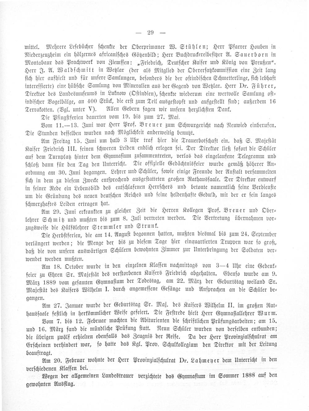 Am Freitag 15. Juni um halb 3 Uhr traf hier die Trauerbotſchaft ein, daß S. Majeſtät Kaiſer Friedrich III. ſeinen ſchweren Leiden endlich erlegen ſei. Der Direktor ließ ſofort die Schüler auf dem Turnplatz hinter dem Gymnaſium zuſammentreten, verlas das eingelaufene Telegramm und ſchloß dann für den Tag den Unterricht. Die offizielle Gedächtnisfeier wurde gemäß höherer An⸗ ordnung am 30. Juni begangen. Lehrer und Schüler, ſowie einige Freunde der Anſtalt verſammelten ſich in dem zu dieſem Zwecke entſprechend ausgeſtatteten großen Rathausſaale. Der Direktor entwarf in ſeiner Rede ein Lebensbild des entſchlafenen Herrſchers und betonte namentlich ſeine Verdienſte um die Gründung des neuen deutſchen Reiches und ſeine heldenhafte Geduld, mit der er ſein langes ſchmerzhaftes Leiden ertragen hat.