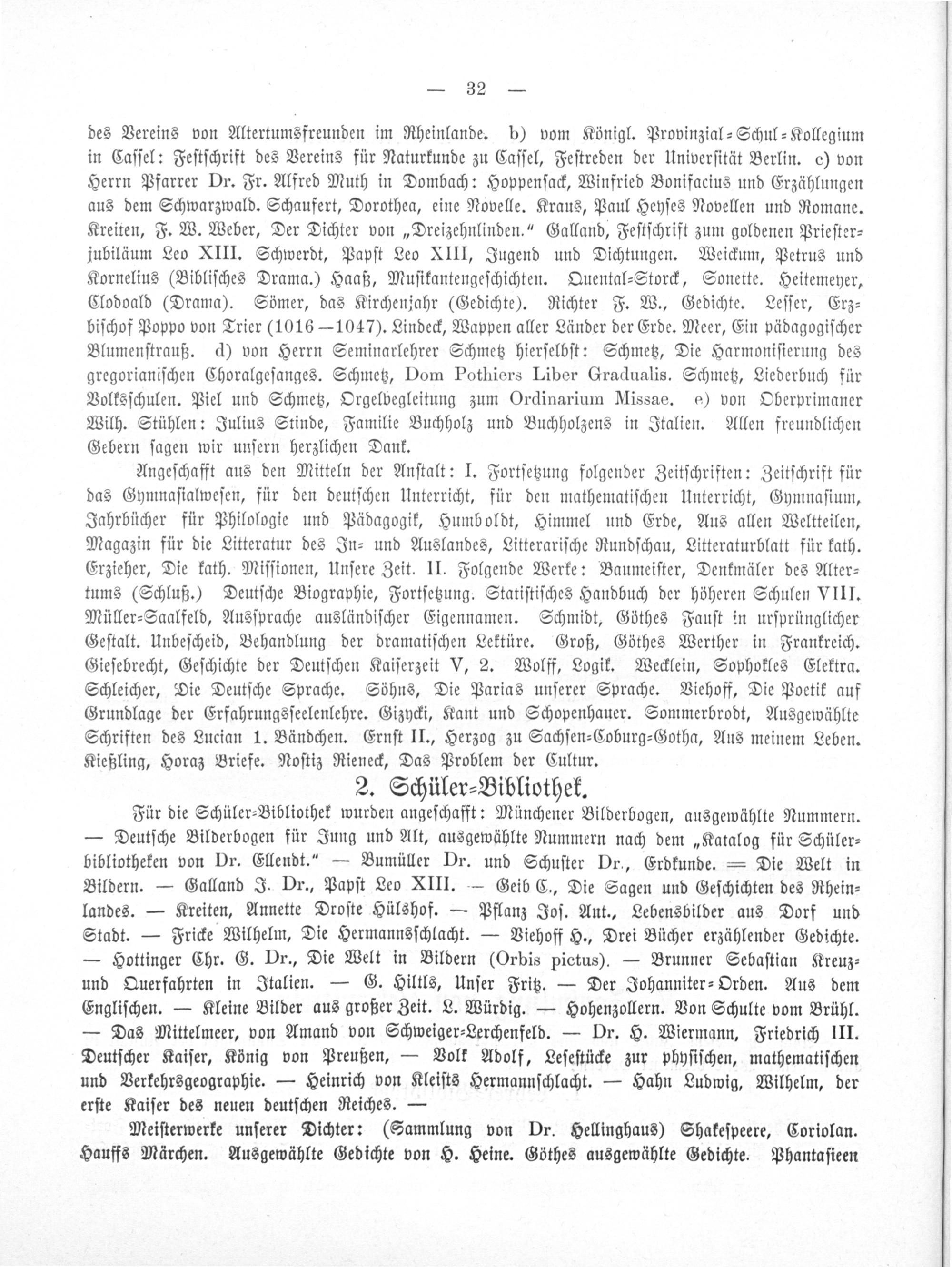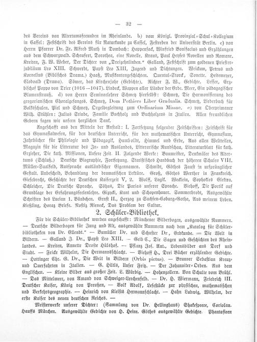 Angeſchafft aus den Mitteln der Anſtalt: I. Fortſetzung folgender Zeitſchriften: Zeitſchrift für das Gymnaſialweſen, für den deutſchen Unterricht, für den mathematiſchen Unterricht, Gymnaſium, Jahrbücher für Philologie und Pädagogik, Humboldt, Himmel und Erde, Aus allen Weltteilen, Magazin für die Litteratur des In- und Auslandes, Litterariſche Rundſchau, Litteraturblatt für kath. Erzieher, Die kath. Miſſionen, Unſere Zeit. II. Folgende Werke: Baumeiſter, Denkmäler des Alter⸗ tums(Schluß.) Deutſche Biographie, Fortſetzung. Statiſtiſches Handbuch der höheren Schulen VIII. Müller-Saalfeld, Ausſprache ausländiſcher Eigennamen. Schmidt, Göthes Fauſt in urſprünglicher Geſtalt. Unbeſcheid, Behandlung der dramatiſchen Lektüre. Groß, Göthes Werther in Frankreich. Gieſebrecht, Geſchichte der Deutſchen Kaiſerzeit V, 2. Wolff, Logik. Wecklein, Sophokles Elektra. Schleicher, Die Deutſche Sprache. Söhns, Die Parias unſerer Sprache. Viehoff, Die Poetik auf Grundlage der Erfahrungsſeelenlehre. Gizycki, Kant und Schopenhauer. Sommerbrodt, Ausgewählte Schriften des Lucian 1. Bändchen. Ernſt II., Herzog zu Sachſen⸗Coburg⸗Gotha, Aus meinem Leben. Kießling, Horaz Briefe. Noſtiz Rieneck, Das Problem der Cultur.