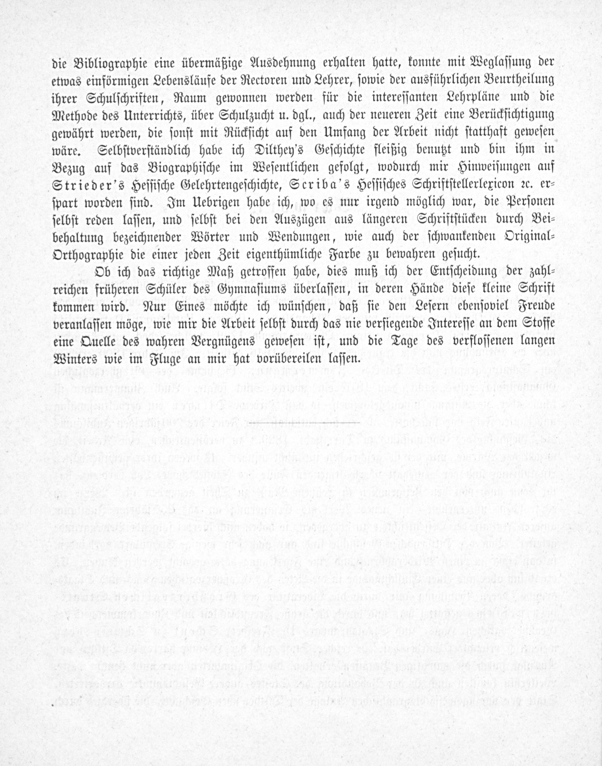 die Bibliographie eine übermäßige Ausdehnung erhalten hatte, konnte mit Weglaſſung der etwas einförmigen Lebensläufe der Rectoren und Lehrer, ſowie der ausführlichen Beurtheilung ihrer Schulſchriften, Raum gewonnen werden für die intereſſanten Lehrpläne und die Methode des Unterrichts, über Schulzucht u. dgl., auch der neueren Zeit eine Berückſichtigung gewährt werden, die ſonſt mit Rückſicht auf den Umfang der Arbeit nicht ſtatthaft geweſen wäre. Selbſtverſtändlich habe ich Dilthey's Geſchichte fleißig benutzt und bin ihm in Bezug auf das Biographiſche im Weſentlichen gefolgt, wodurch mir Hinweiſungen auf Strieder's Heſſiſche Gelehrtengeſchichte, Seriba's Heſſiſches Schriftſtellerlexicon ꝛc. er⸗ ſpart worden ſind. Im Uebrigen habe ich, wo es nur irgend möglich war, die Perſonen ſelbſt reden laſſen, und ſelbſt bei den Auszügen aus längeren Schriftſtücken durch Bei⸗ behaltung bezeichnender Wörter und Wendungen, wie auch der ſchwankenden Original⸗ Orthographie die einer jeden Zeit eigenthümliche Farbe zu bewahren geſucht.