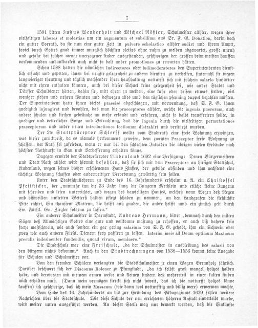 Unter den Stadtſchullehrern zu Ende des 16. Jahrhunderts erſcheint u. A. ein Chriſtoffel Pfeilſticker, der„nunmehr inn die 33 Jahr lang die Jungenn Methlein und etliche kleine Jungenn mit ſchreiben und leſen unterrichtet, und wegen des bawfelligen Hauſes, welcheß vonn Wegen deß Regen und bißweillen unſtetten Wetterß halben pflegt ſchaden zu nemmen, an den Landgrafen die flehlichſte Pitte richtet, Ein thauſſent Blattenn, die helfft auß gnaden, die andre helfft umb ein zimlich gelt durch Ew. Fürſtl. Gn. Ziegler folgenn zu laſſen.“