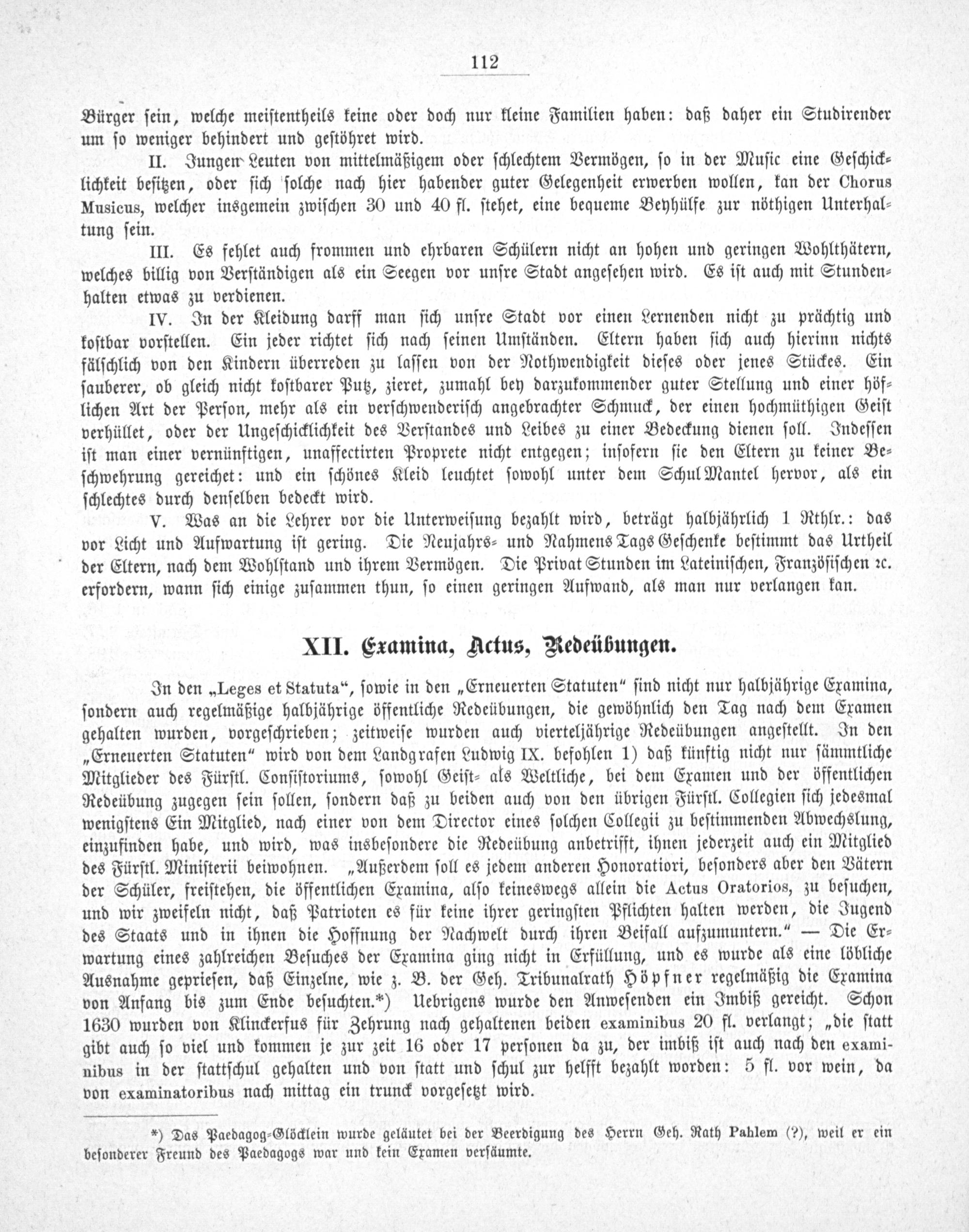 In den„Leges et Statuta“, ſowie in den„Erneuerten Statuten“ ſind nicht nur halbjährige Examina, ſondern auch regelmäßige halbjährige öffentliche Redeübungen, die gewöhnlich den Tag nach dem Examen gehalten wurden, vorgeſchrieben; zeitweiſe wurden auch vierteljährige Redeübungen angeſtellt. In den „Erneuerten Statuten“ wird von dem Landgrafen Ludwig IX. befohlen 1) daß künftig nicht nur ſämmtliche Mitglieder des Fürſtl. Conſiſtoriums, ſowohl Geiſt⸗ als Weltliche, bei dem Examen und der öffentlichen Redeübung zugegen ſein ſollen, ſondern daß zu beiden auch von den übrigen Fürſtl. Collegien ſich jedesmal wenigſtens Ein Mitglied, nach einer von dem Director eines ſolchen Collegii zu beſtimmenden Abwechslung, einzufinden habe, und wird, was insbeſondere die Redeübung anbetrifft, ihnen jederzeit auch ein Mitglied des Fürſtl. Miniſterii beiwohnen.„Außerdem ſoll es jedem anderen Honoratiori, beſonders aber den Vätern der Schüler, freiſtehen, die öffentlichen Examina, alſo keineswegs allein die Actus Oratorios, zu beſuchen, und wir zweifeln nicht, daß Patrioten es für keine ihrer geringſten Pflichten halten werden, die Jugend des Staats und in ihnen die Hoffnung der Nachwelt durch ihren Beifall aufzumuntern.“— Die Er⸗ wartung eines zahlreichen Beſuches der Examina ging nicht in Erfüllung, und es wurde als eine löbliche Ausnahme geprieſen, daß Einzelne, wie z. B. der Geh. Tribunalrath Höpfner regelmäßig die Examina von Anfang bis zum Ende beſuchten.*) Uebrigens wurde den Anweſenden ein Imbiß gereicht. Schon 1630 wurden von Klinckerfus für Zehrung nach gehaltenen beiden examinibus 20 fl. verlangt;„die ſtatt gibt auch ſo viel und kommen je zur zeit 16 oder 17 perſonen da zu, der imbiß iſt auch nach den exami- nibus in der ſtattſchul gehalten und von ſtatt und ſchul zur helfft bezahlt worden: 5 fl. vor wein, da von examinatoribus nach mittag ein trunck vorgeſetzt wird.