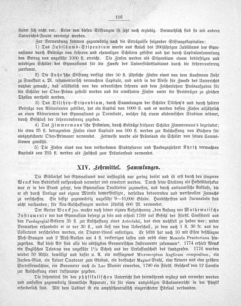 2) Die Fuhr'ſche Stiftung verfügt über 50 fl. jährliche Zinſen eines von dem Kaufmann Fuhr zu Frankfurt a. M. teſtamentariſch vermachten Capitals, und wird in der Weiſe für Zwecke des Unterrichts nutzbar gemacht, daß alljährlich von den ordentlichen Lehrern und dem Zeichenlehrer Preisaufgaben für die Schüler der Ober⸗Prima geſtellt werden und die erwähnten Zinſen unter die Preisträger zu gleichen Theilen vertheilt werden.