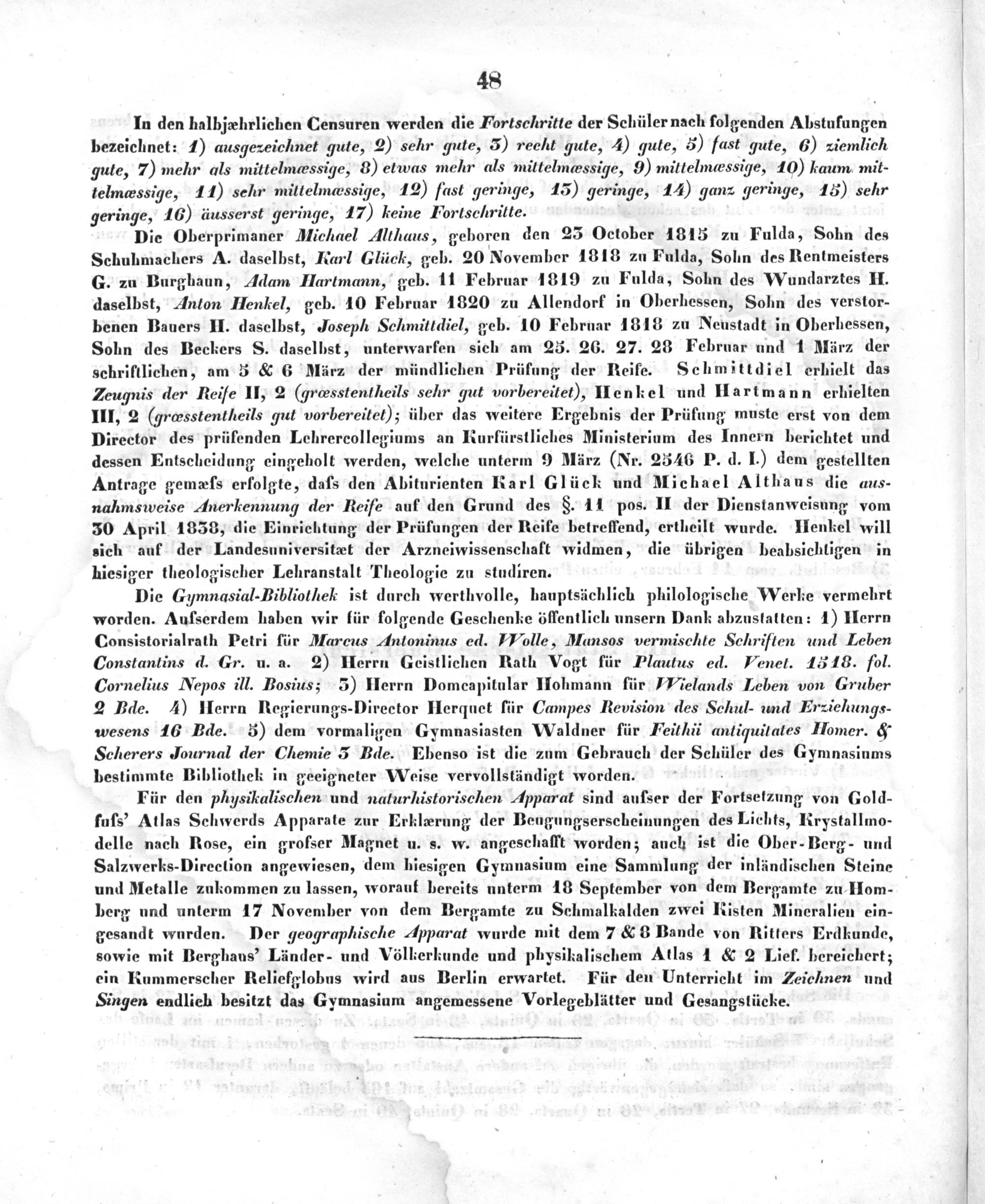 Die Oberprimaner Michael Althaus, geboren den 25 October 1315 zu Fulda, Sohn des Schuhmachers A. daselbst, Karl Glück, geb. 20 November 1318 zu Fulda, Sohn des Rentmeisters G. zu Burghaun, Adam Hartmann, geb. 11 Februar 1319 zu Fulda, Sohn des Wundarztes H. daselbst, Anton Henkel, geb. 10 Februar 1320 zu Allendorf in Oberhessen, Sohn des verstor- benen Bauers II. daselbst, Joseph Selmittdiel, geb. 10 Februar 1318 zu Neustadt in Oberhessen, Sohn des Beckers S. daselbst, unterwarfen sich am 25. 26. 27. 23 Februar und 1 März der schriftlichen, am 5& 6 März der mündlichen Prüfung der Reife. Schmittdiel erhielt das Zeugnis der Reife II, 2(grœsstentheils sehr gut vorbereitet), Ienkel und Hartmann erhielten III, 2(grœsstentheils gut vorbereitet); üher das weitere Ergebnis der Prüfung muste erst von dem Director des prüfenden Lehrercollegiums an Rurfürstliches Ministerium des Innern berichtet und dessen Entschcidung eingeholt werden, welche unterm 9 März(Nr. 2546 P. d. I.) dem gestellten Antrage gemefs erfolgte, daſs den Abiturienten Rarl Glück und Michael Althaus die aus- nahmsweise Inerkennung der Reife auf den Grund des§. 11 pos. II der Dienstanweisung vom 30 April 1338, die Einrichtung der Prüfungen der Reife betreffend, ertheilt wurde. Henkel will sich auf der Landesuniversitæt der Arzneiwissenschaft widmen, die übrigen beabsichtigen in hiesiger theologischer Lehranstalt Theologie zu studiren.