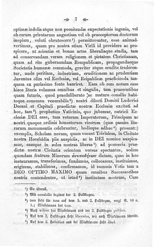 optimæ indolis atque non poenitendæ expectationis ingenia, vel ob rerum privatarum angustiam vel ob praeceptorum doctorum inopiam, veluti obrutescere¹) permitterentur, esse animad- vertimus, quam pro nostra etiam Virili id providere ac pro- spicere, ut scientiæ et bonae artes liberaliaque studia, tam ad conservandam veram religionem et pietatem Christianam, quam ad rite gubernandam Rempublicam, propagandaeque Societatis humanæ commoda, graviter atque erudite traderen- tur, unde peritiam, industriam, eruditionem ac prudentiam Juventus olim vel Ecclesiæ, vel Reipublice praeficienda tan- quam ex purissimo fonte hauriret. Eam ob rem notum esse hisce literis volumus omnibus et singulis, tam praesentibus quam futuris, quod praedeliberato †lac maturo consilio habi- toque consensu venerabilis ²) nostri dilecti Domini Ludovici Decani et Capituli praedicte nostræ Ecclesie excitati ad hoc, tam ³) prophetico Vaticinio, quo jubemur, nutricii Eec- clesie DEl esse, tum veterum Imperatorum, Principum ac nostri quoque ordinis honestorum virorum(quæ passim lite- rarum monumentis celebrantur, hodieque adhuc ⁴¹) prosunt:) exemplis, Scholam novam, quam vocant Trivialem, in Civitate nostra Hersfeldia piis auspiciis, ac in DEI nomine auspica- mur, eamque in ædes nostras liberas ⁵) ad pomcœria prae- dicte nostre Civitatis orientem versus spectantes, sedem quondam fratrum Minorum dvvxooè*jro dictam, quas in hoc instauramus, transferimus, fundamus, collocamus, instituimus, erigimus, stabilimus, confirmamus, id summis Votis tam a DEO OPTIMO MAXIMO quam omnibus Successoribus nostris contendentes, ut istud ⁶) institutum nostrum, Cum