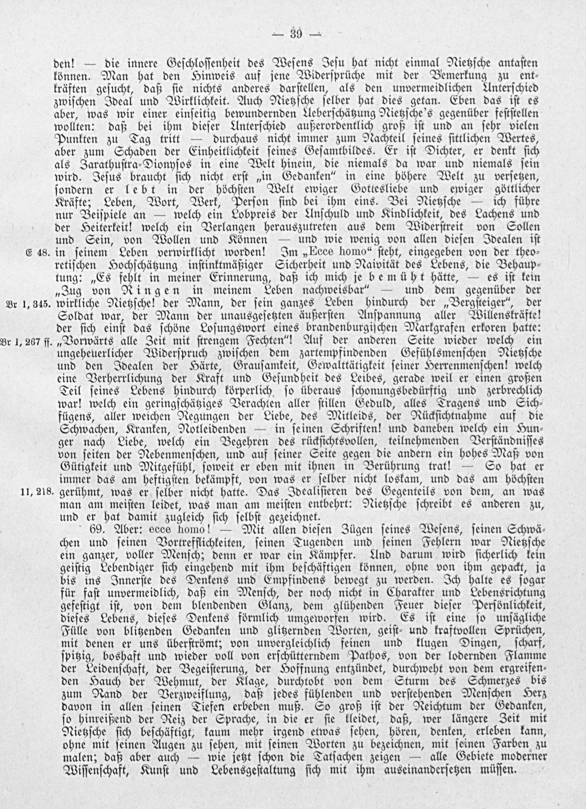 69. Aber: ecce homo!— Mit allen dieſen Zügen ſeines Weſens, ſeinen Schwä⸗ chen und ſeinen Vortrefflichkeiten, ſeinen Tugenden und ſeinen Fehlern war Nietzſche ein ganzer, voller Menſch; denn er war ein Kämpfer. And darum wird ſicherlich kein geiſtig Lebendiger ſich eingehend mit ihm beſchäftigen können, ohne von ihm gepackt, ja bis ins Innerſte des Denkens und Empfindens bewegt zu werden. Ich halte es ſogar für faſt unvermeidlich, daß ein Menſch, der noch nicht in Charakter und Lebensrichtung gefeſtigt iſt, von dem blendenden Glanz, dem glühenden Feuer dieſer Perſönlichkeit, dieſes Lebens, dieſes Denkens förmlich umgeworfen wird. Es iſt eine ſo unſägliche Fülle von blitzenden Gedanken und glitzernden Worten, geiſt⸗ und kraftvollen Sprüchen, mit denen er uns überſtrömt; von unvergleichlich feinen und klugen Dingen, ſcharf, ſpitzig, boshaft und wieder voll von erſchütterndem Pathos, von der lodernden Flamme der Leidenſchaft, der Begeiſterung, der Hoffnung entzündet, durchweht von dem ergreifen⸗ den Hauch der Wehmut, der Klage, durchtobt von dem Sturm des Schmerzes bis zum Rand der Verzweiflung, daß jedes fühlenden und verſtehenden Menſchen Herz davon in allen ſeinen Tiefen erbeben muß. So groß iſt der Reichtum der Gedanken, ſo hinreißend der Reiz der Sprache, in die er ſie kleidet, daß, wer längere Zeit mit Nietzſche ſich beſchäftigt, kaum mehr irgend etwas ſehen, hören, denken, erleben kann, ohne mit ſeinen Augen zu ſehen, mit ſeinen Worten zu bezeichnen, mit ſeinen Farben zu malen; daß aber auch— wie jetzt ſchon die Tatſachen zeigen— alle Gebiete moderner Wiſſenſchaft, Kunſt und Lebensgeſtaltung ſich mit ihm auseinanderſetzen müſſen.