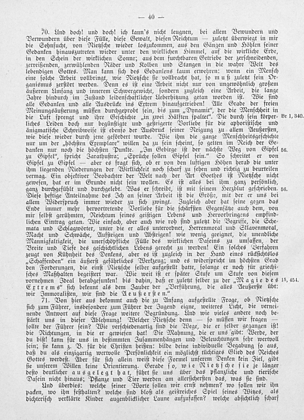71. Von hier aus bekommt auch die zu Anfang aufgeſtellte Frage, ob Nietzſche ſich zum Führer, insbeſondere zum Führer der Jugend eigne, weiteres Licht, die vernei⸗ nende Antwort auf dieſe Frage weitere Begründung. And wie vieles andere noch be⸗ ſtärkt uns in dieſer Ablehnung! Welcher Nietzſche denn— ſo müſſen wir fragen— ſollte der Führer ſein? Wie verſchiedenartig ſind die Wege, die er ſelber gegangen iſt! die Nichtungen, in die er gewieſen hat! Die Mahnung, die er uns gibt: Werde, der du biſt! kann für uns in beſtimmten Zuſammenhängen und Beleuchtungen ſehr wertvoll ſein; ſie kann z. B. für die Chriſten heißen: bilde deine individuelle Begabung ſo aus, daß du als einzigartig wertvolle Perſönlichkeit ein möglichſt tüchtiges Glied des Reiches Gottes werdeſt. Aber für ſich allein weiſt dieſe Formel unſerem Denken kein Ziel, gibt ſie unſerem Willen keine Orientierung. Gerade ſo, wie Nietzſche ſie je länger deſto deutlicher ausgelegt hat, führt ſie uns über das pflanzliche und tieriſche Daſein nicht hinaus; Pflanze und Tier werden am allerſicherſten das, was ſie ſind.
