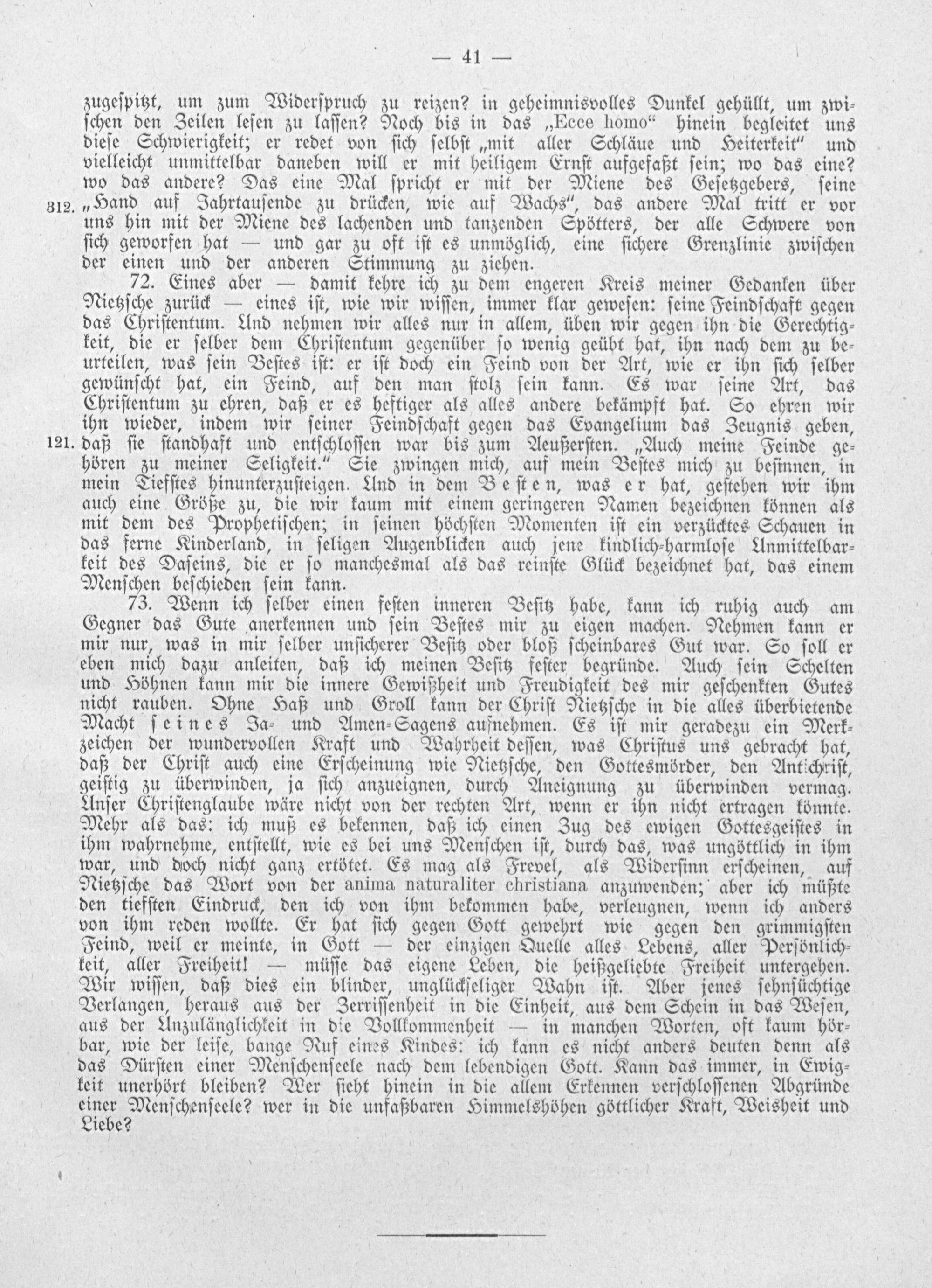 72. Eines aber— damit kehre ich zu dem engeren Kreis meiner Gedanken über Nietzſche zurück— eines iſt, wie wir wiſſen, immer klar geweſen: ſeine Feindſchaft gegen das Chriſtentum. And nehmen wir alles nur in allem, üben wir gegen ihn die Gerechtig⸗ keit, die er ſelber dem Chriſtentum gegenüber ſo wenig geübt hat, ihn nach dem zu be⸗ urteilen, was ſein Beſtes iſt: er iſt doch ein Feind von der Art, wie er ihn ſich ſelber gewünſcht hat, ein Feind, auf den man ſtolz ſein kann. Es war ſeine Art, das Chriſtentum zu ehren, daß er es heftiger als alles andere bekämpft hat. So ehren wir ihn wieder, indem wir ſeiner Feindſchaft gegen das Evangelium das Zeugnis geben, daß ſie ſtandhaft und entſchloſſen war bis zum Aeußerſten.„Auch meine Feinde ge⸗ hören zu meiner Seligkeit.“ Sie zwingen mich, auf mein Beſtes mich zu beſinnen, in mein Tiefſtes hinunterzuſteigen. And in dem Beſten, was er hat, geſtehen wir ihm auch eine Größe zu, die wir kaum mit einem geringeren Namen bezeichnen können als mit dem des Prophetiſchen; in ſeinen höchſten Momenten iſt ein verzücktes Schauen in das ferne Kinderland, in ſeligen Augenblicken auch jene kindlich⸗harmloſe Anmittelbar⸗ keit des Daſeins, die er ſo manchesmal als das reinſte Glück bezeichnet hat, das einem Menſchen beſchieden ſein kann.