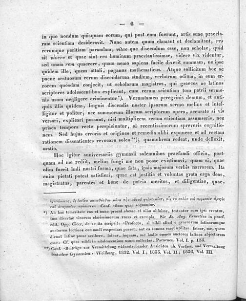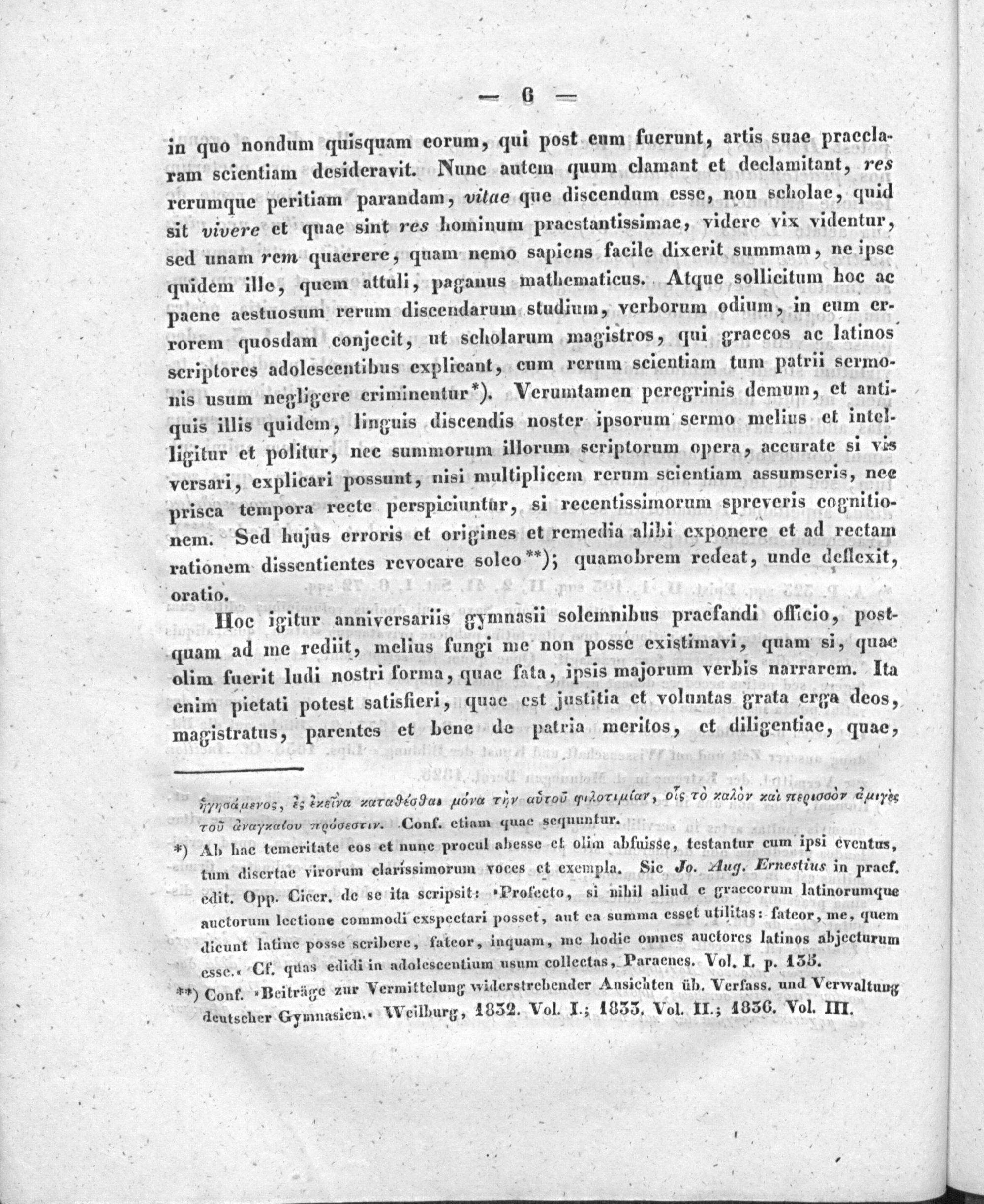 *) Ab hac temeritate eos et nunc procul abesse ct olim abfuisse, testantur cum ipsi eventus, tum disertae virorum clarissimorum voces et exempla. Sic Jo. Mug. Ernestius in praef. edit. Opp. Cicer. de se ita scripsit:„Profecto, si nihil aliud e graecorum latinorumque auctorum lectione commodi exspectari posset, aut ca summa esset utilitas: fateor, me, quem dicunt latine posse scribere, fateor, inquam, mc hodie omnes auctores latinos abjecturum esse.« Cf. quas edidi in adolescentium usum collectas, Paraenes. Vol. I. p. 135.