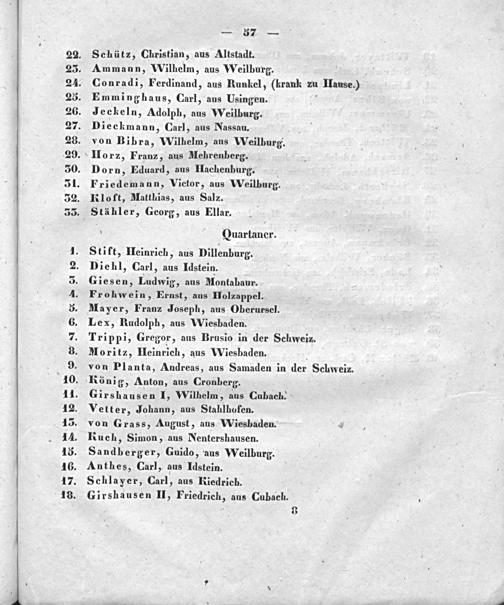 Girshausen I, Wilhelm, aus Cubach. Vetter, Johann, aus Stahlhofen. von Grass, August, aus Wiesbaden. Ruch, Simon, aus Nentershausen. Sandberger, Guido, aus Weilburg. Anthes, Carl, aus Idstein. Schlayer, Carl, aus Riedrich. Girshausen II, Friedrich, aus Cubach.