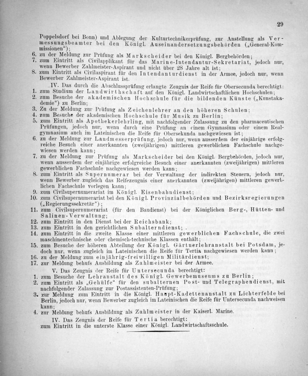 V. Das Zeugnis der Reife für Untersecunda berechtigt: zum Besuche der Lehranstalt des Königl. Gewerbemuseums zu Berlin; zum Eintritt als„Gehülfe“ für den subalternen Post- und Telegraphendienst, mit nachfolgender Zulassung zur Postassistenten-Prüfung; zur Meldung zum Eintritt in die Königl. Hanpt-Kadettenanstalt zu Lichterfelde bei Berlin, jedoch nur, wenn Bewerber zugleich im Lateinischen die Reife für Untersecunda nachweisen kann; zur Meldung behufs Ausbildung als Zahlm eister in der Kaiserl. Marine.