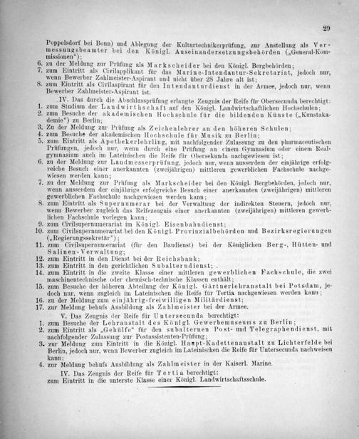 IV. Das durch die Abschlussprüfung erlangte Zeugnis der Reife für Obersecunda berechtigt: zum Studium der Land wirthschaft auf den Königl. Landwirtschaftlichen Hochschulen; zum Besuche der akademischen Hochschule für die bildenden Künste(„Kunstaka- demie“) zu Berlin;