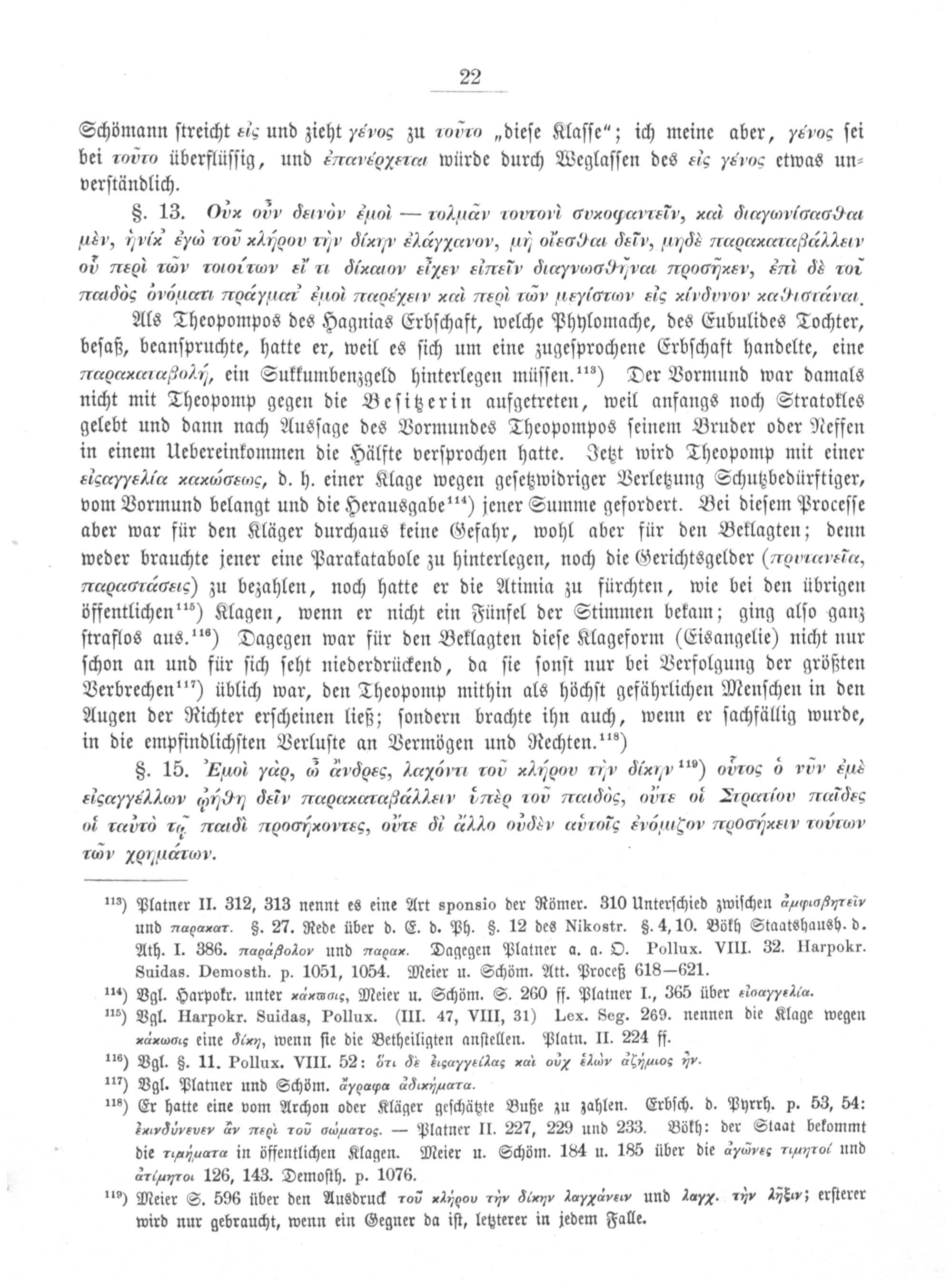 Als Theopompos des Hagnias Erbſchaft, welche Phylomache, des Eubulides Tochter, beſaß, beanſpruchte, hatte er, weil es ſich um eine zugeſprochene Erbſchaft handelte, eine Taνκαηαςονp, ein Sukkumbenzgeld hinterlegen müſſen.¹¹*³) Der Vormund war damals nicht mit Theopomp gegen die Beſitzerin aufgetreten, weil anfangs noch Stratokles gelebt und dann nach Ausſage des Vormundes Theopompos ſeinem Bruder oder Neffen in einem Uebereinkommen die Hälfte verſprochen hatte. Jetzt wird Theopomp mit einer elccyyedia zνααιασαεαανα, d. h. einer Klage wegen geſetzwidriger Verletzung Schutzbedürftiger, vom Vormund belangt und die Herausgabe“¹*⁴) jener Summe gefordert. Bei dieſem Proceſſe aber war für den Kläger durchaus keine Gefahr, wohl aber für den Beklagten; denn weder brauchte jener eine Parakatabole zu hinterlegen, noch die Gerichtsgelder(roνιμαηνε, Tεαασναἀαςσμεε) zu bezahlen, noch hatte er die Atimia zu fürchten, wie bei den übrigen öffentlichen“¹*⁵³) Klagen, wenn er nicht ein Fünfel der Stimmen bekam; ging alſo ganz ſtraflos aus.¹¹²⁴) Dagegen war für den Beklagten dieſe Klageform(Eisangelie) nicht nur ſchon an und für ſich ſeht niederdrückend, da ſie ſonſt nur bei Verfolgung der größten Verbrechen¹¹*¹) üblich war, den Theopomp mithin als höchſt gefährlichen Menſchen in den Augen der Richter erſcheinen ließ; ſondern brachte ihn auch, wenn er ſachfällig wurde, in die empfindlichſten Verluſte an Vermögen und Rechten. ¹¹²)