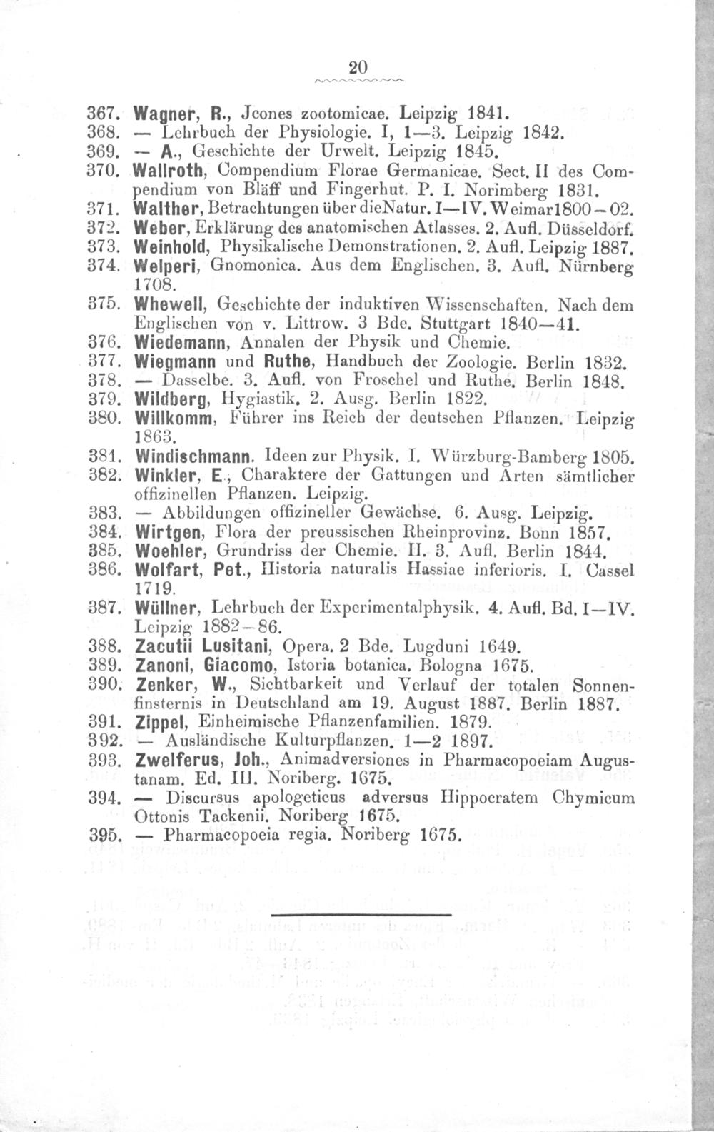 . Walther, Betrachtungen über die Natur.— IV. Weimar1800— 02. . Weber, Erklärung des anatomischen Atlasses. 2. Aufl. Düsseldorf. . Weinhold, Physikalische Demonstrationen. 2. Aufl. Leipzig 1887. Welperi, Gnomonica. Aus dem Englischen. 3. Aufl. Nürnberg