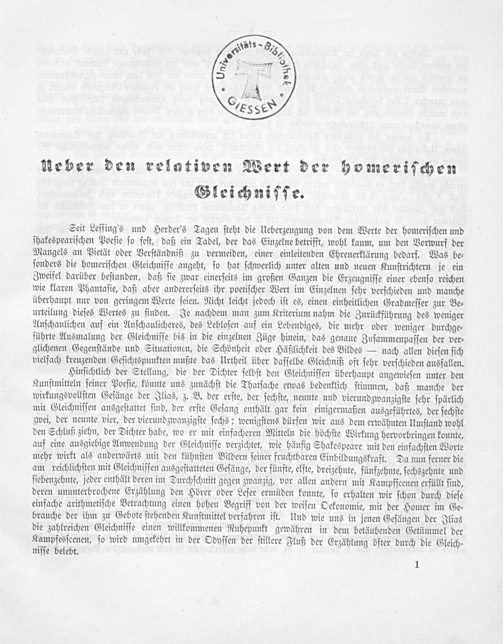 Seit Leſſing's und Herder's Tagen ſteht die Ueberzeugung von dem Werte der homeriſchen und ſhakespeariſchen Poeſie ſo feſt, daß ein Tadel, der das Einzelne betrifft, wohl kaum, um den Vorwurf der Mangels an Pietät oder Verſtändniß zu vermeiden, einer einleitenden Ehrenerklärung bedarf. Was be⸗ ſonders die homeriſchen Gleichniſſe angeht, ſo hat ſchwerlich unter alten und neuen Kunſtrichtern je ein Zweifel darüber beſtanden, daß ſie zwar einerſeits im großen Ganzen die Erzeugniſſe einer ebenſo reichen wie klaren Phantaſie, daß aber andererſeits ihr poetiſcher Wert im Einzelnen ſehr verſchieden und manche überhaupt nur von geringem Werte ſeien. Nicht leicht jedoch iſt es, einen einheitlichen Gradmeſſer zur Be⸗ urteilung dieſes Wertes zu finden. Je nachdem man zum Kriterium nahm die Zurückführung des weniger Anſchaulichen auf ein Anſchaulicheres, des Lebloſen auf ein Lebendiges, die mehr oder weniger durchge⸗ führte Ausmalung der Gleichniſſe bis in die einzelnen Züge hinein, das genaue Zuſammenpaſſen der ver⸗ glichenen Gegenſtände und Situationen, die Schönheit oder Häßlichkeit des Bildes— nach allen dieſen ſich vielfach kreuzenden Geſichtspunkten mußte das Urtheil über daſſelbe Gleichniß oft ſehr verſchieden ausfallen.