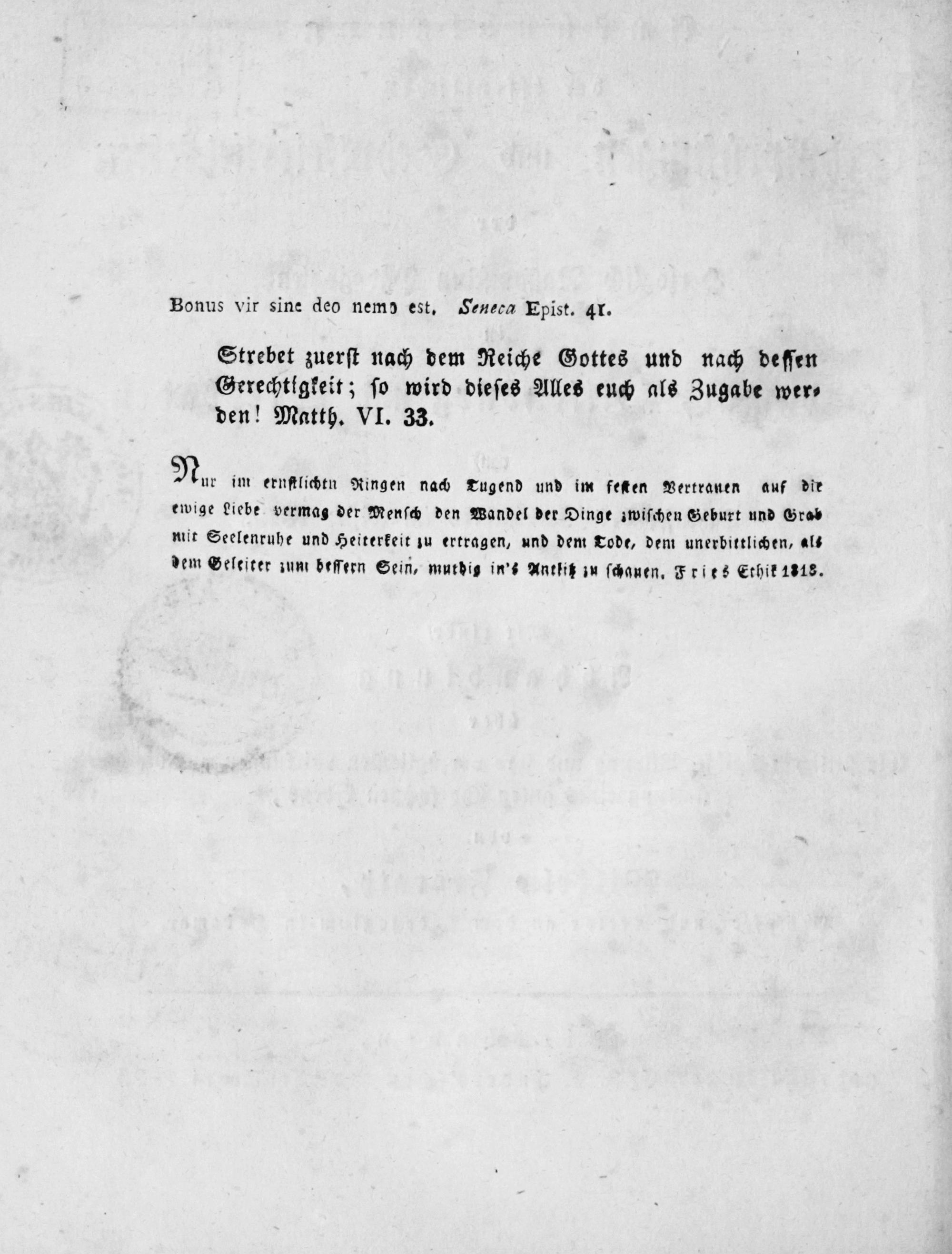 N. im ernſtlichtn Ringen nach Tugend und im feſten Vertranen auf die ewige Liebe vermag der Menſch den Wandel der Dinge zwiſchen Geburt und Grab mit Seelenruhe und Heiterkeit zu ertragen, und dem Tode, dem unerbittlichen, als dem Geleiter zum beſfern Sein, muthis in's Antkit zu ſchauen, Fries Ethik 1818.