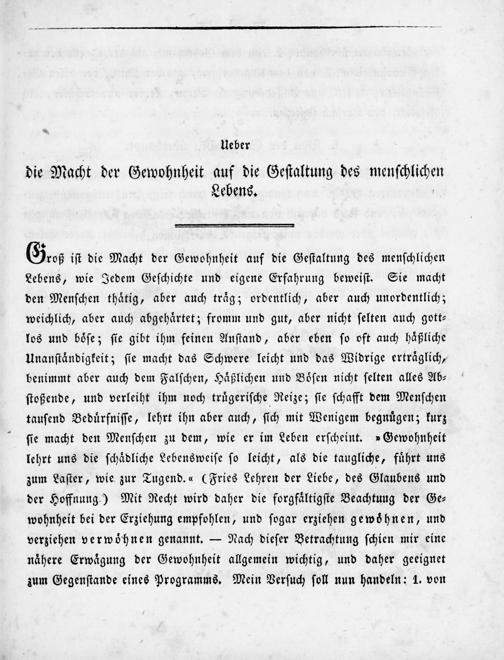 Geoß iſt die Macht der Gewohnheit auf die Geſtaltung des menſchlichen Lebens, wie Jedem Geſchichte und eigene Erfahrung beweiſt. Sie macht den Menſchen thaͤtig, aber auch traͤg; ordentlich, aber auch unordentlich; weichlich, aber auch abgehaͤrtet; fromm und gut, aber nicht ſelten auch gott— los und boͤſe; ſie gibt ihm feinen Anſtand, aber eben ſo oft auch haͤßliche Unanſtaͤndigkeit; ſie macht das Schwere leicht und das Widrige ertraͤglich, benimmt aber auch dem Falſchen, Haͤßlichen und Boͤſen nicht ſelten alles Ab⸗ ſtoßende, und verleiht ihm noch truͤgeriſche Reize; ſie ſchafft dem Menſchen tauſend Beduͤrfniſſe, lehrt ihn aber auch, ſich mit Wenigem begnuͤgen; kurz ſie macht den Menſchen zu dem, wie er im Leben erſcheint.»Gewohnheit lehrt uns die ſchaͤdliche Lebensweiſe ſo leicht, als die taugliche, fuͤhrt uns zum Laſter, wie zur Tugend.«(Fries Lehren der Liebe, des Glaubens und der Hoffnung.) Mit Recht wird daher die forgfaͤltigſte Beachtuug der Ge⸗ wohnheit bei der Erziehung empfohlen, und ſogar erziehen gewoͤhnen, und verziehen verwoͤhnen genannt.— Nach dieſer Betrachtung ſchien mir eine naͤhere Erwaͤgung der Gewohnheit allgemein wichtig, und daher geeignet zum Gegenſtande eines Programms. Mein Verſuch ſoll nun handeln: 1. von