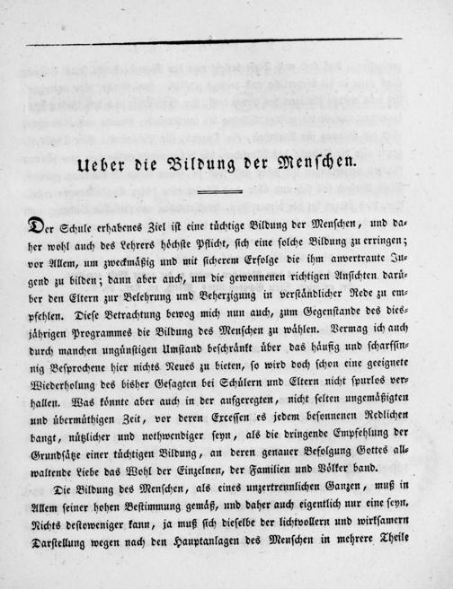 Der Schule erhabenes Ziel iſt eine tuͤchtige Bildung der Menſchen, und da⸗ her wohl auch des Lehrers hoͤchſte Pflicht, ſich eine ſolche Bildung zu erringen; vor Allem, um zweckmaͤßig und mit ſicherem Erfolge die ihm anvertraute Ju⸗ gend zu bilden; dann aber auch, um die gewonnenen richtigen Anſichten daruͤ⸗ ber den Eltern zur Belehrung und Beherzigung in verſtaͤndlicher Rede zu em— pfehlen. Dieſe Betrachtung bewog mich nun auch, zum Gegenſtande des dies⸗ jaͤhrigen Programmes die Bildung des Menſchen zu waͤhlen. Vermag ich auch durch manchen unguüͤnſtigen Umſtand beſchraͤnkt uͤber das haͤufig und ſcharfſin⸗ nig Beſprochene hier nichts Neues zu bieten, ſo wird doch ſchon eine geeignete Wiederholung des bisher Geſagten bei Schuͤlern und Eltern nicht ſpurlos ver⸗ hallen. Was koͤnnte aber auch in der aufgeregten, nicht ſelten ungemaͤßigten und uͤbermuͤthigen Zeit, vor deren Exceſſen es jedem beſonnenen Redlichen bangt, nuͤtzlicher und nothwendiger ſeyn, als die dringende Empfehlung der Grundſaͤtze einer tuͤchtigen Bildung, an deren genauer Befolgung Gottes all⸗ waltende Liebe das Wohl der Einzelnen, der Familien und Voͤlker band.. Die Bildung des Menſchen, als eines unzertrennlichen Ganzen, muß in Allem ſeiner hohen Beſtimmung gemaͤß, und daher auch eigentlich nur eine ſeyn. Nichts deſtoweniger kann, ja muß ſich dieſelbe der lichtvollern und wirkſamern Darſtellung wegen nach den Hauptanlagen des Menſchen in mehrere Theile