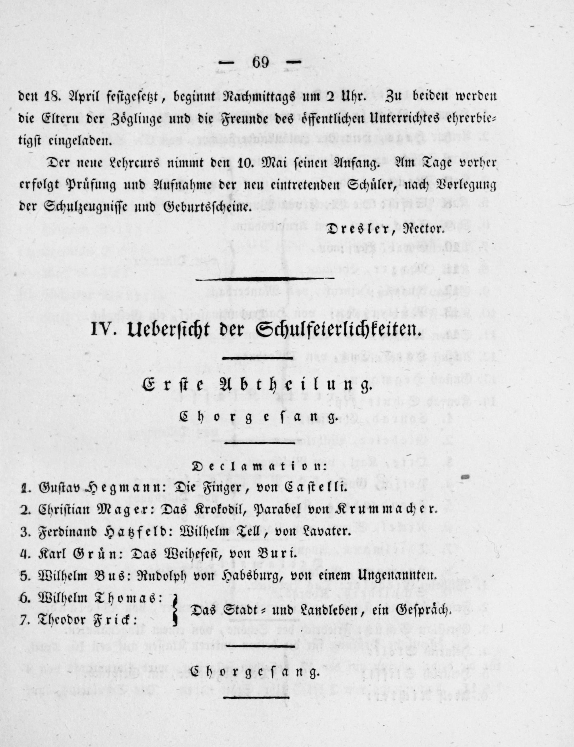 Declamation: 1. GuſtavHegmann: Die Finger, von Caſtelli. 2. Chriſtian Mager: Das Krokodil, Parabel von Krummacher. 3. Ferdinand Hatzfeld: Wilhelm Tell, von Lavater. 4. Karl Gruͤn: Das Weihefeſt, von Buri. 5. Wilhelm Bus: Rudolph von Habsburg, von einem Ungenannten. 6. Wilhelm Thomas: