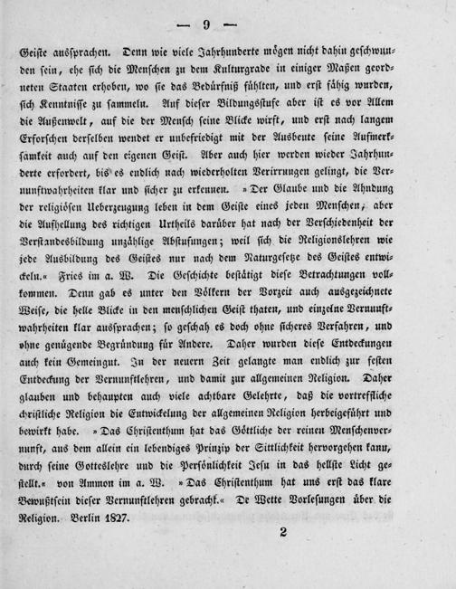 Geiſte ausſprachen. Denn wie viele Jahrhunderte moͤgen nicht dahin geſchwun⸗ den ſein, ehe ſich die Menſchen zu dem Kulturgrade in einiger Maßen geord— neten Staaten erhoben, wo ſie das Beduͤrfniß fuͤhlten, und erſt faͤhig wurden, ſich Kenntniſſe zu ſammeln. Auf dieſer Bildungsſtufe aber iſt es vor Allem die Außenwelt, auf die der Menſch ſeine Blicke wirft, und erſt nach langem Erforſchen derſelben wendet er unbefriedigt mit der Ausbeute ſeine Aufmerk⸗ ſamkeit auch auf den eigenen Geiſt. Aber auch hier werden wieder Jahrhun⸗ derte erfordert, bis es endlich nach wiederholten Verirrungen gelingt, die Ver⸗ nunftwahrheiten klar und ſicher zu erkennen.»Der Glaube und die Ahndung der religioͤſen Ueberzeugung leben in dem Geiſte eines jeden Menſchen, aber die Aufhellung des richtigen Urtheils daruͤber hat nach der Verſchiedenheit der Verſtandesbildung unzaͤhlige Abſtufungen; weil ſich die Religionslehren wie jede Ausbildung des Geiſtes nur nach dem Naturgeſetze des Geiſtes entwi⸗ ckeln.« Fries im a. W. Die Geſchichte beſtaͤtigt dieſe Betrachtungen voll⸗ kommen. Denn gab es unter den Voͤlkern der Vorzeit auch ausgezeichnete Weiſe, die helle Blicke in den menſchlichen Geiſt thaten, und einzelne Vernunft⸗ wahrheiten klar ausſprachen; ſo geſchah es doch ohne ſicheres Verfahren, und ohne genuͤgende Begruͤndung fuͤr Andere. Daher wurden dieſe Entdeckungen auch kein Gemeingut. In der neuern Zeit gelangte man endlich zur feſten Entdeckung der Vernunftlehren, und damit zur allgemeinen Religion. Daher glauben und behaupten auch viele achtbare Gelehrte, daß die vortreffliche chriſtliche Religion die Entwickelung der allgemeinen Religion herbeigefuͤhrt und bewirkt habe.»Das Chriſtenthum hat das Goͤttliche der reinen Menſchenver⸗ nunft, aus dem allein ein lebendiges Prinzip der Sittlichkeit hervorgehen kann, durch ſeine Gotteslehre und die Perſoͤnlichkeit Jeſu in das hellſte Licht ge⸗ ſtellt.« von Ammon im a. W.»Das Chriſtenthum hat uns erſt das klare Bewußtſein dieſer Vernunftlehren gebracht.“ De Wette Vorleſungen uͤber die