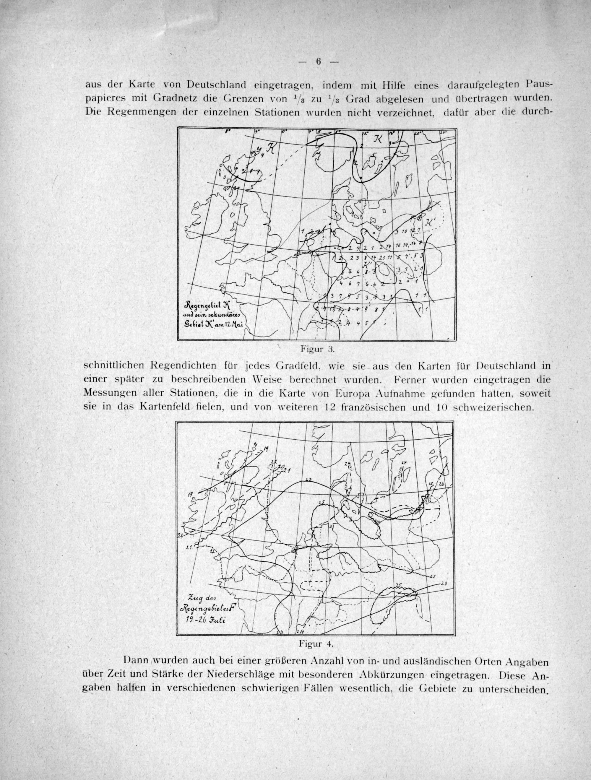 über Zeit und Stärke der Niederschläge mit besonderen Abkürzungen eingetragen. Diese An- gaben halfen in verschiedenen schwierigen Fällen wesentlich, die Gebiete zu unterscheiden.