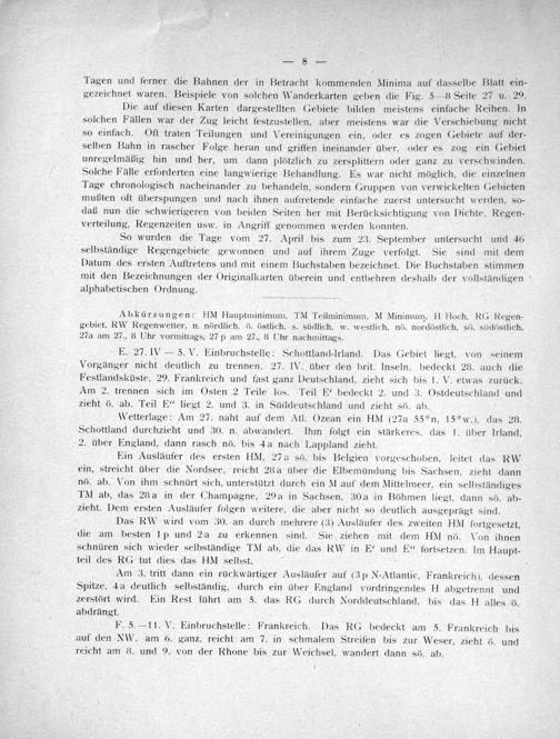 Die auf diesen Karten dargestellten Gebiete bilden meistens einfache Reihen. In solchen Fällen war der Zug leicht festzustellen, aber meistens war die Verschiebung nicht so einfach. Oft traten Teilungen und Vereinigungen ein, oder es zogen Gebiete auf der- selben Bahn in rascher Folge heran und griffen ineinander über, oder es zog ein Gebiet unregelmäßig hin und her, um dann plötzlich zu zersplittern oder ganz zu verschwinden. Solche Fälle erforderten eine langwierige Behandlung. Es war nicht möglich, die einzelnen Tage chronologisch nacheinander zu behandeln, sondern Gruppen von verwickelten Gebieten mußten oft überspungen und nach ihnen auftretende einfache zuerst untersucht werden, so- daß nun die schwierigeren von beiden Seiten her mit Berücksichtigung von Dichte. Regen- verteilung, Regenzeiten usw. in Angriff genommen werden konnten.