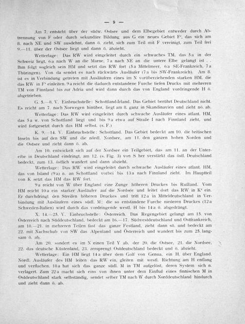 Am 7. entsteht über der südw. Ostsee und dem Elbegebiet entweder durch Ab- trennung von F oder durch sekundäre Bildung aus G ein neues Gebiet F“, das sich am 8. nach NE und SW ausdehnt, dann 5. zieht, sich zum Teil mit F vereinigt, zum Teil frei 9.— 11. über der Ostsee liegt und dann ö. abzieht.