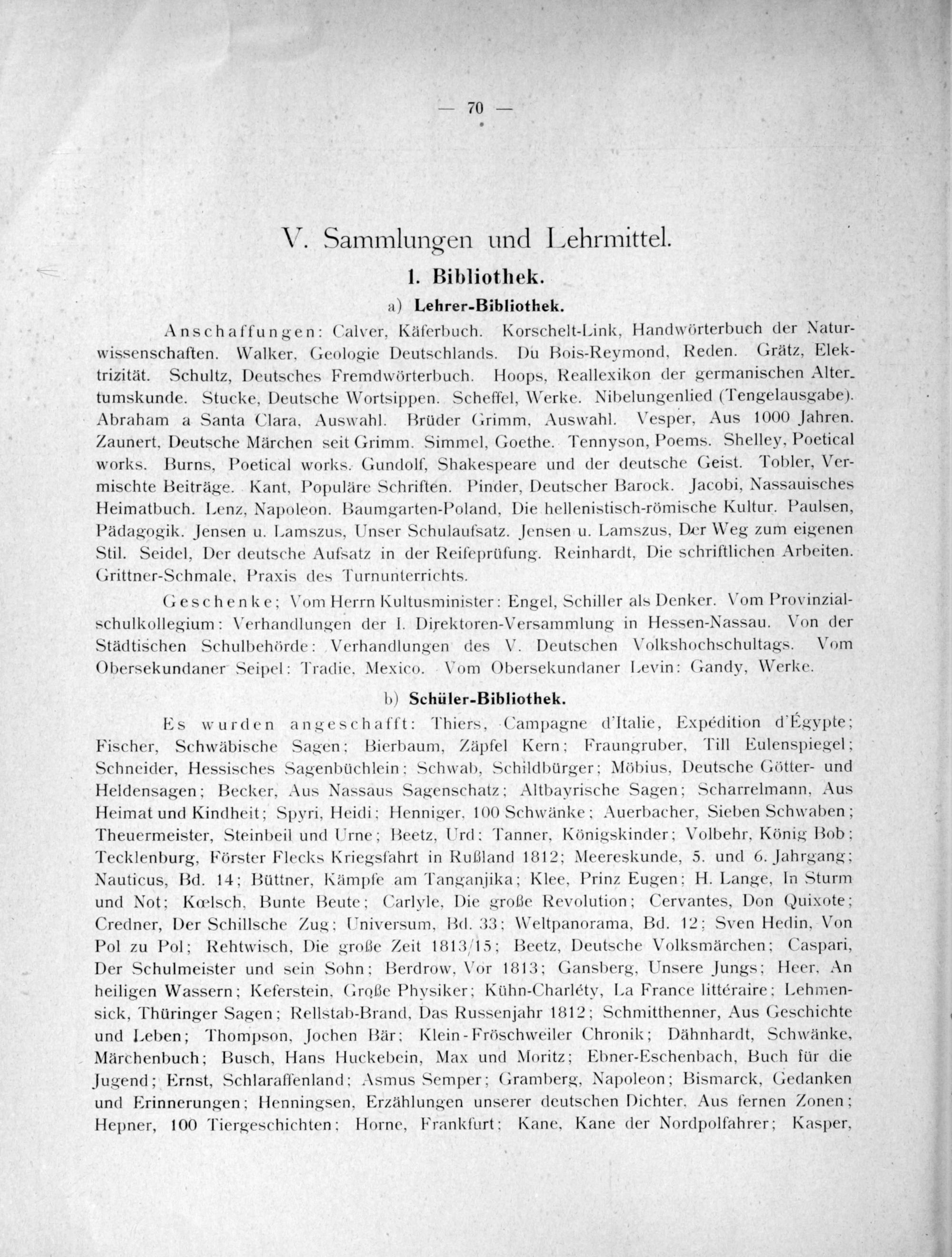 Anschaffungen: Calver, Käferbuch. Korschelt-Link, Handwörterbuch der Natur- wissenschaften. Walker. Geologie Deutschlands. Du Bois-Reymond, Reden. Grätz, Elek- trizität. Schultz, Deutsches Fremdwörterbuch. Hoops, Reallexikon der germanischen Alter. tumskunde. Stucke, Deutsche Wortsippen. Scheffel, Werke. Nibelungenlied(Tengelausgabe). Abraham a Santa Clara., Auswahl. Brüder Grimm, Auswahl. Vesper, Aus 1000 Jahren. Zaunert, Deutsche Märchen seit Grimm. Simmel, Goethe. Tennyson, Poems. Shelley, Poetical works. Burns, Poetical works. Gundolf, Shakespeare und der deutsche Geist. Tobler, Ver- mischte Beiträge. Kant, Populâre Schriften. Pinder, Deutscher Barock. Jacobi, Nassauisches Heimatbuch. Lenz, Napoleon. Baumgarten-Poland, Die hellenistisch-römische Kultur. Paulsen, Pädagogik. Jensen u. Lamszus, Unser Schulaufsatz. Jensen u. Lamszus, Der Weg zum eigenen Stil. Seidel, Der deutsche Aufsatz in der Reifeprüfung. Reinhardt, Die schriftlichen Arbeiten. Grittner-Schmale, Praxis des Turnunterrichts.
