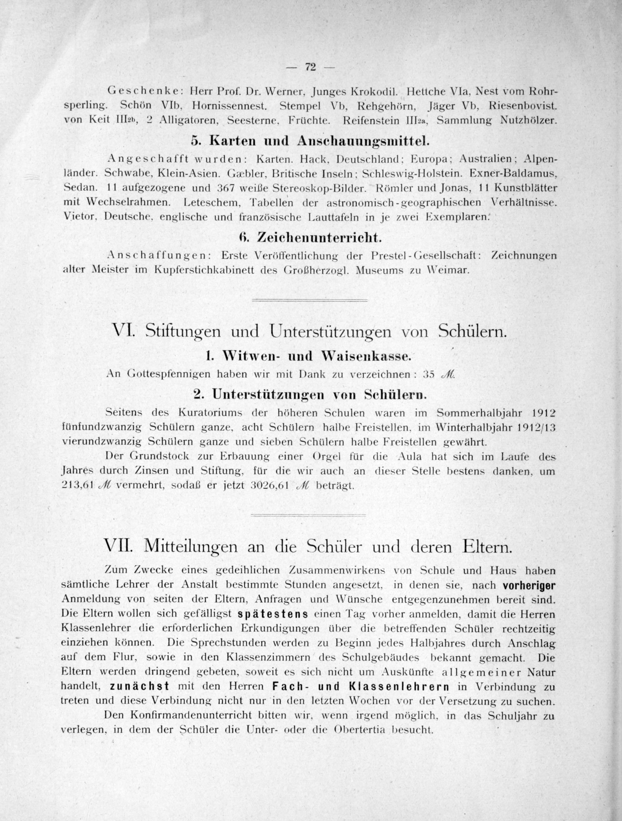 Seitens des Kuratoriums der höheren Schulen waren im Sommerhalbjahr 1912 fünfundzwanzig Schülern ganze, acht Schülern halbe Freistellen, im Winterhalbjahr 1912/13 vierundzwanzig Schülern ganze und sieben Schülern halbe Freistellen gewährt.