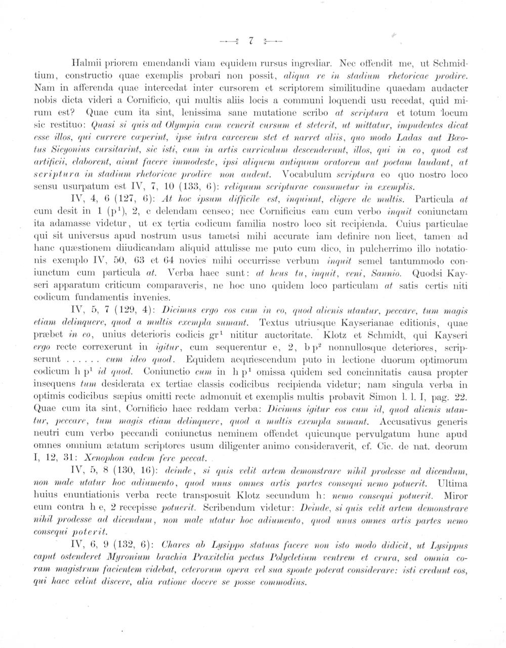 IV, 4, 6(127, 6): At hoc ipsum difficile est, inquiunt, eligere de multis. Particula at cum desit in 1(p¹), 2, c delendam censeo; nec Cornificius eam cum verbo inquit coniunctam ita adamasse videtur, ut ex tertia codicum familia nostro loco sit recipienda. Cuius particulae qui sit universus apud nostrum usus tametsi mihi accurate iam definire non licet, tamen ad hanc quæstionem diiudicandam aliquid attulisse me puto cum dico, in pulcherrimo illo notatio- nis exemplo IV, 50, 63 et 64 novies mihi occurrisse verbum inquit semel tantummodo con- iunctum cum particula at. Verba haec sunt: at heus tu, inquit, veni, Sannio. Quodsi Kay- seri apparatum criticum comparaveris, ne hoc uno quidem loco particulam at satis certis niti codicum fundamentis invenies.