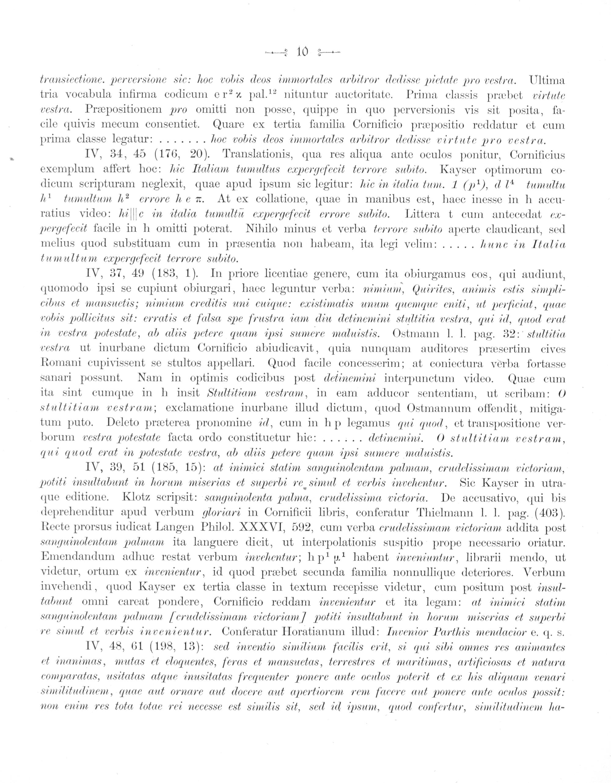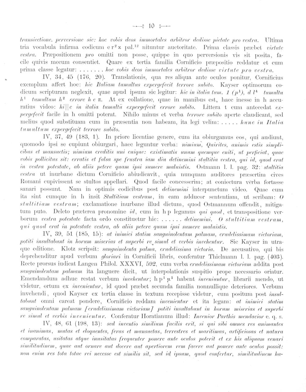 IV, 39, 51(185, 15): at inimici statim sanguinolentam palmam, erudelissimam victoriam, potiti insultabunt in horum miserias et superbi re simul et verbis invehentur. Sic Kayser in utra-— que editione. Klotz scripsit: sanguinolenta palma, crudelissima eictoria. De accusativo, qui bis deprehenditur apud verbum Roriari in Cornificii libris, conferatur Thielmann I. I. pag.(403). Recte prorsus iudicat Langen Philol. XXXVI, 592, cum verba erudelissimam vickoriam addita post sanguinolentam palmam ita languere dicit, ut interpolationis suspitio prope necessario oriatur. Emendandum adhuc restat verbum invehentur; hpipl habent inveniuntur, librarii mendo, ut. videtur, ortum ex invenientur, id quod præbet secunda familia nonnullique deteriores. Verbum invehendi, quod Kayser ex tertia classe in textum recepisse videtur, cum positum post insul- kabunt omni careat pondere, Cornificio reddam invenientur et ita legam: at inimici statim sanguinolentam palmam ferudelissimam vickoriamf potiti insultabunt in horum miserias æt superhi re simul et verbis invenientur. Conferatur Horatianum illud: Invenior Parthis menduacior e. q. s.
