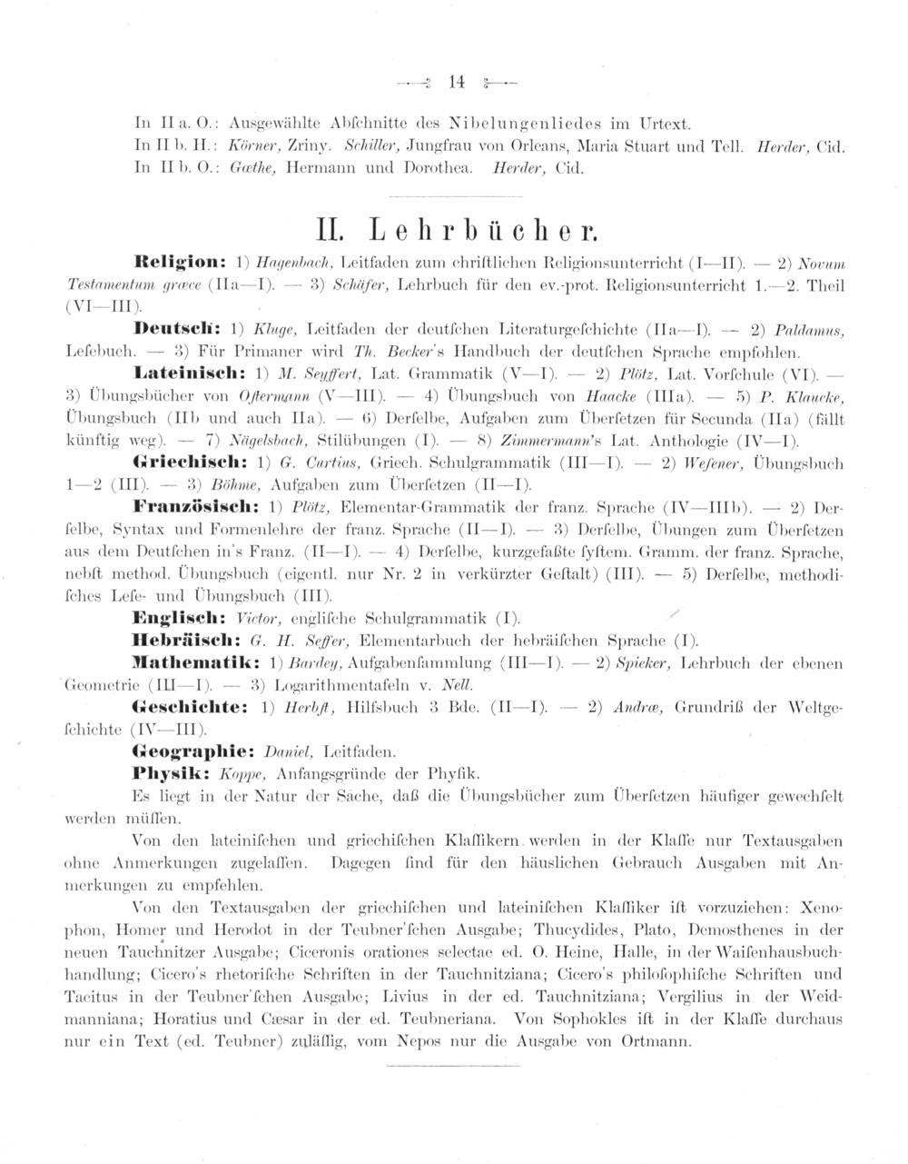 Lateinisch: 1) M. Seuhert, Lat. Grammatik(V— I).— 2) Plötz, Lat. Vorſchule(VI).— 3) UÜbungsbücher von Oftermann(V— III).— 4) UÜbungsbuch von Haacke(IIIa).— 5) P. Klaucke, Ubungsbuch(IIb und auch IIa).— 6) Derſelbe, Aufgaben zum Überſetzen für Secunda(IIa)(fällt künftig weg).— 7) Nägelsbach, Stilübungen(I).— 8) Zimmermann's Lat. Anthologie(IV— I).