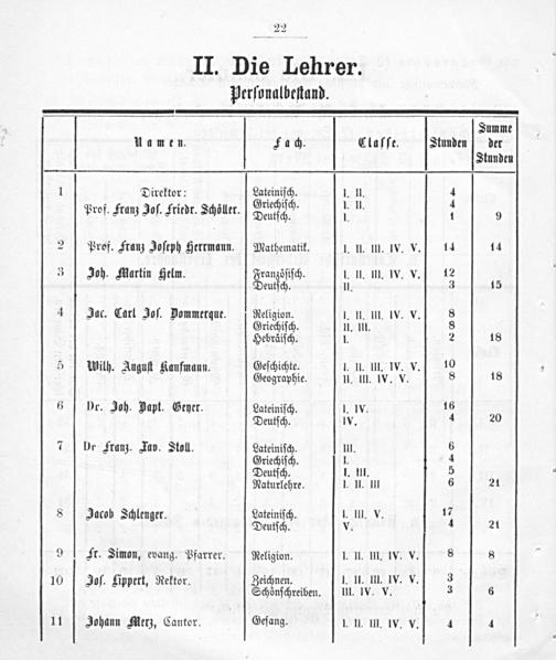 Perſonalbeſtand. “ Summe Uamen. Fach. Claſſe. Stunden der Stunden 1 Direktor: Lateiniſch. 1. 1 4 Prof. Franz Joſ. Friedr. Schöller. Vrihiſch 1 1 1 9 2 Prof. Franz Joſeph Herrmann. Mathematik. 1. I. ul. Iv. V. 14 14 3 Joh. Martin Helm. Franzöſiſch. I. II. III. IV. Vv. 12 3 Deutſch. Il. 3 15 4 Zac. Carl Joſ. Dommerque. Religion. I. HI. III. IV. V. 8 Griechiſch. II. III. 8 Hebräiſch. 1. 2 18 5 WWilh. Auguſt Kaufmann. Geſchichte. 1. I. m. W. v. 10 h. Auguſt Kan Geographie. II. III. IV. V. 8 18 6 Dr. Joh. Dapt. Geyer. Lateiniſch. 1. V. 16 3 Deutſch. W. 4 20 7 ODr Franz. Jav. Stoll. Lateiniſch. III. 6 Griechiſch. 1. 4 Deutſch. I. nII. 5 Naturlehre. 1. II. II. 6 21 8 AZJacob Schlenger. Lateiniſch. 1. III. V. 17 aleng Deutſch. V. 4 21 9 Fr. Simon, evang. Pfarrer. Religion. 1. I. m. W. v. 8 8 10 oſ. Lippert, Rektor. Zeichnen. 1. IHI. III. IV. v. 3 3ef. Supen, Schöͤnſchreiben. lil. IV. V. 3 6 11 Zohann KMerz, Cantor. Geſang. 1. HI. III. V. v. 4 4